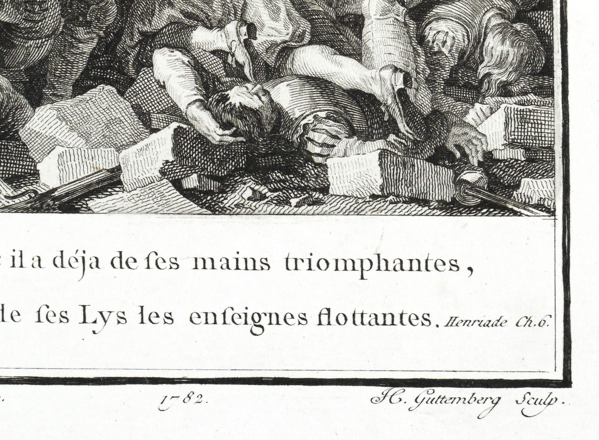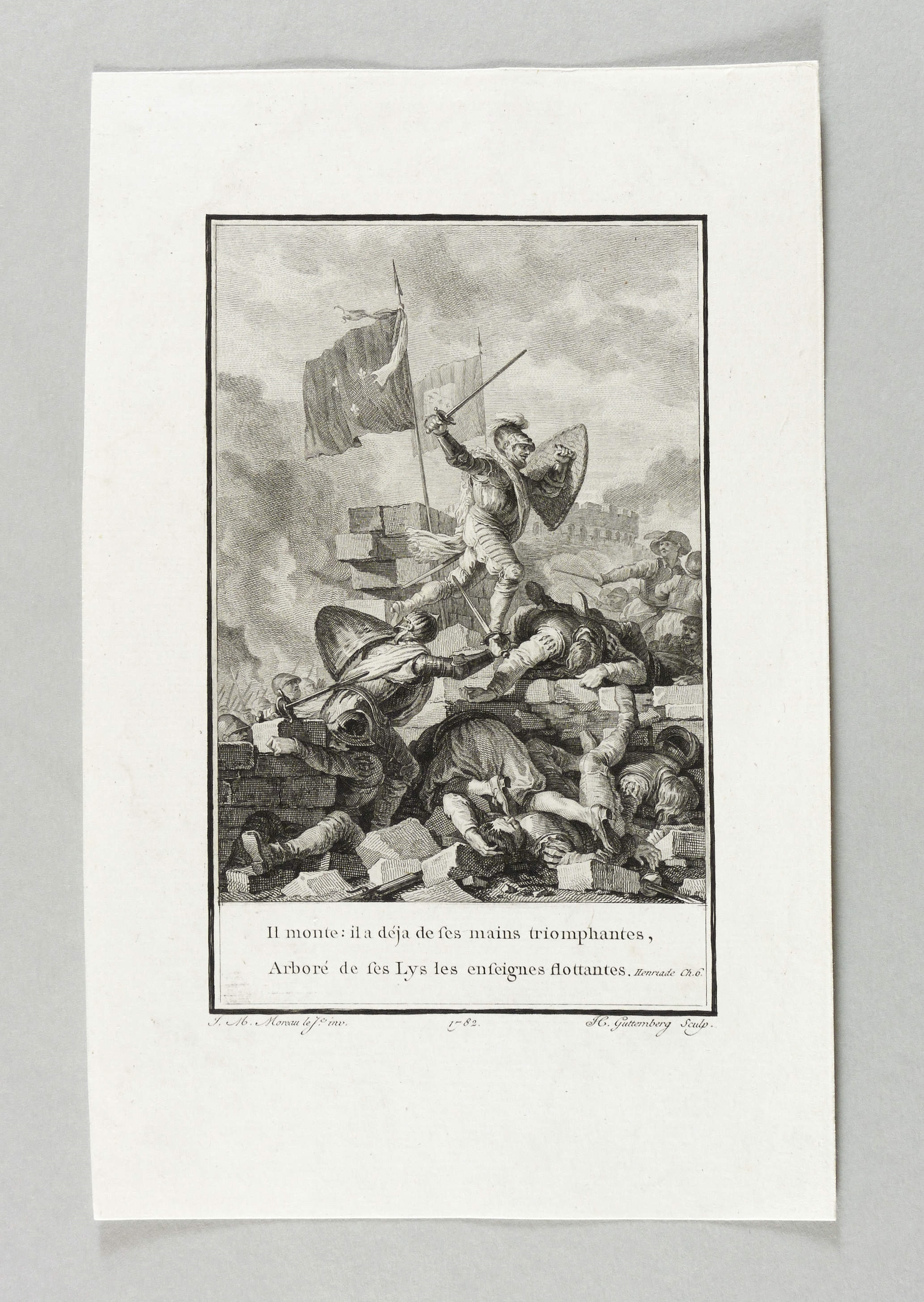 Schrag 72. – In der Platte rechts unten signiert: ″H. Guttemberg Sculp.″ Links bezeichnet und datiert: ″J.M. Moreau le J.e inv. // 1782″. Im Schriftfeld unten die Inschrift: ″Il monte: il a deja de ses mains triomphantes, / Arbore de ses Lys les enseignes flottantes. / Henriade Ch. 6″. – Illustration zu Voltaires ″Henriade″, ein Poem auf den französischen König Heinrich IV. von Navarra. - Schönes charakteristisches Blatt. Bei Schrag hervorgehoben als ″einer der vorzüglichst gelungenen Stiche unsres Meister aus seiner besten Zeit″ (Die Nürnbergischen Künstler ..., Nürnberg: Schrag 1823, S. 72). – Ohne Mängel. Sehr guter Zustand.