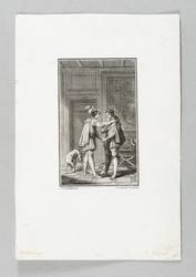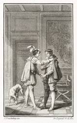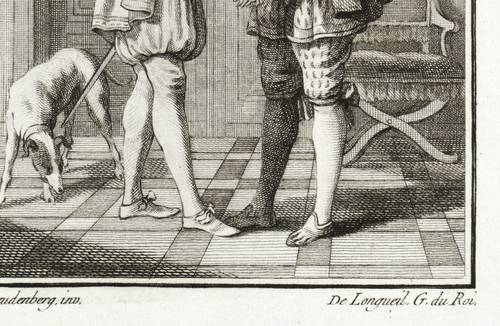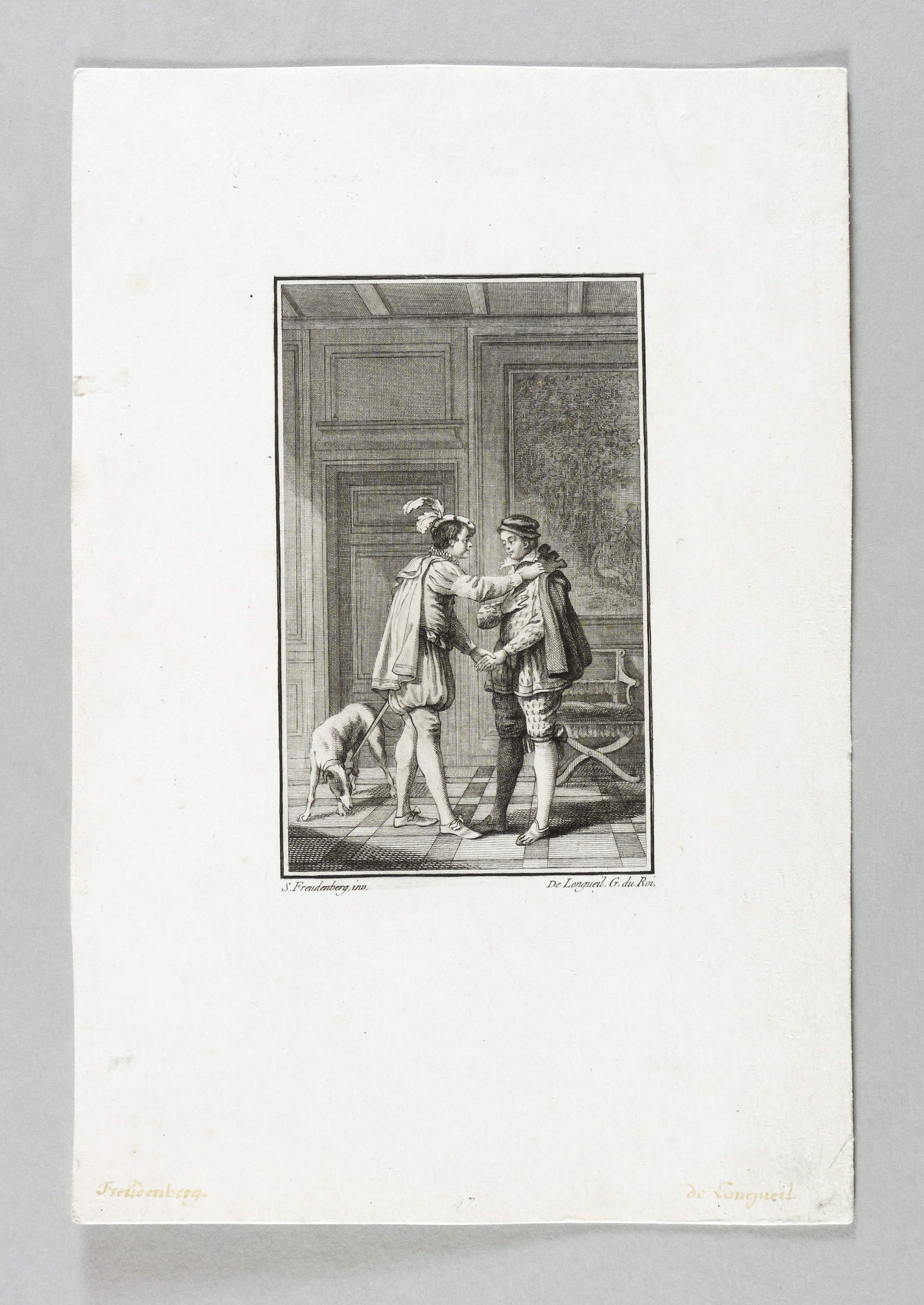 Aus: Margarete von Navarra, Les nouvelles. Heptaméron français (Bern: Walthard & Nouvelle Société Typographique 1780/1781), Bd. 1-3. – In der Platte rechts unten signiert: ″De Longueil G. du Roi.″ In den Blattecken unten in brauner Feder nochmals bezeichnet: ″Freudenberg // de Longueil.″ – Illustration zur reichlich illustrierten ersten Berner Ausgabe des ″Heptaméron″ von Margarete von Navarra. – Sehr guter Zustand.