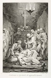 Aus: François-Thomas-Marie de Baculard d’Arnaud, Le comte de Comminge, ou Les amans malheureux (Paris: Le Jay 1768). – In der Platte rechts unten signiert: ″St. Aubin Sculp.″ Links bezeichnet: ″Restout filius inv.″ Dazu die Unterschrift: ″Soutenons ce spectacle, il apprend a mourir″. – Sehr guter Zustand.