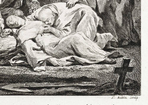 Augustin de Saint-Aubin (1736 Paris - 1807 Paris). Französischer Zeichner und Kupferstecher. Ausbildung bei seinem Bruder Charles Germain de Saint-Aubin. Später Studium bei Étienne Fessard, Nicolas-Henry Tardieu und Laurent Cars. 1752 mit einer Radierung im Salon vertreten. Zahlreiche Aufträge für Exlibris, Frontispiz, Einladungen, Programme und andere kommerzielle Grafik. Dazu Illustrationen für Editionen, wie das "Decameron" von Boccaccio. 1776 zum offiziellen Kupferstecher der Bibliothèque Royale ernannt.