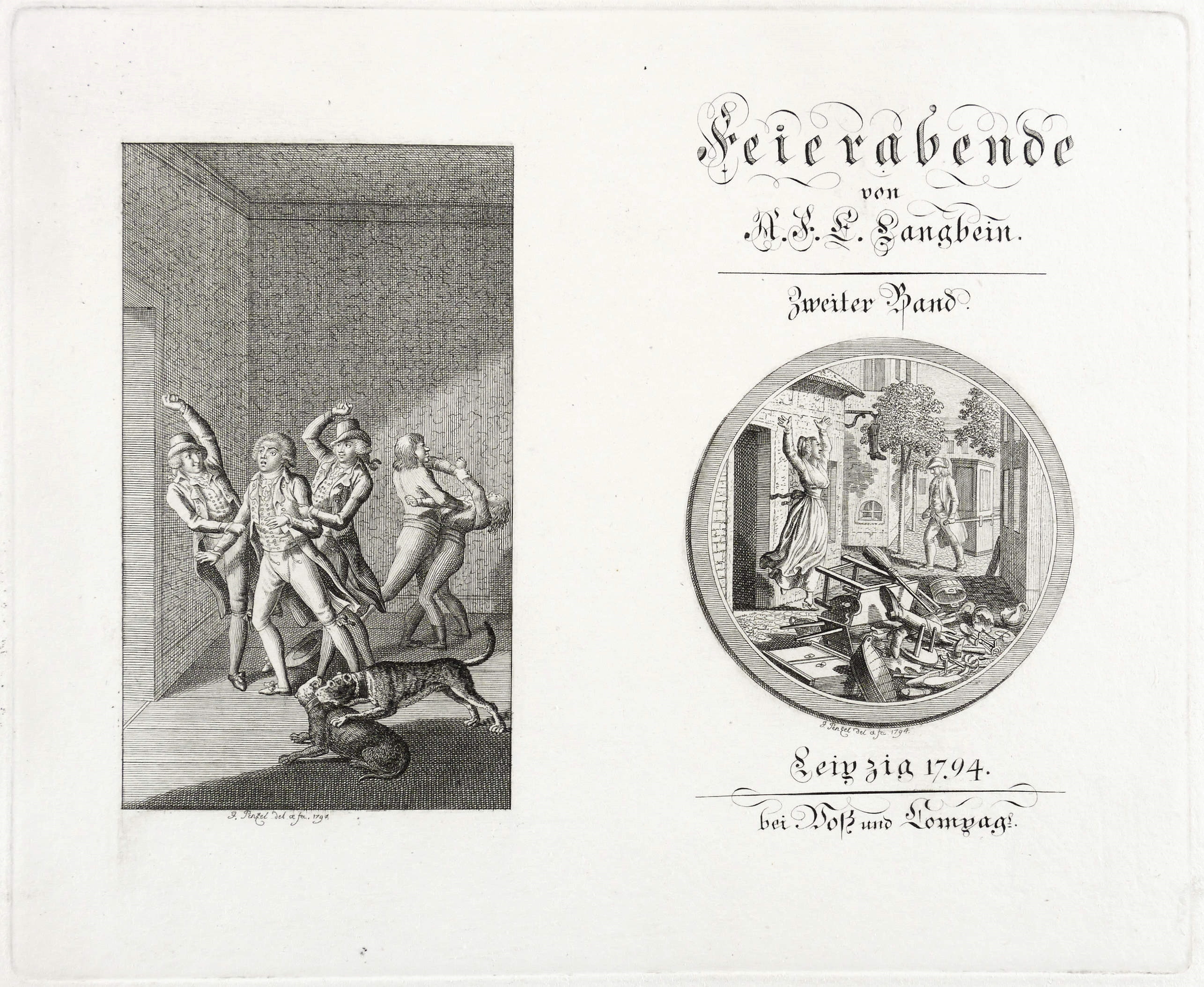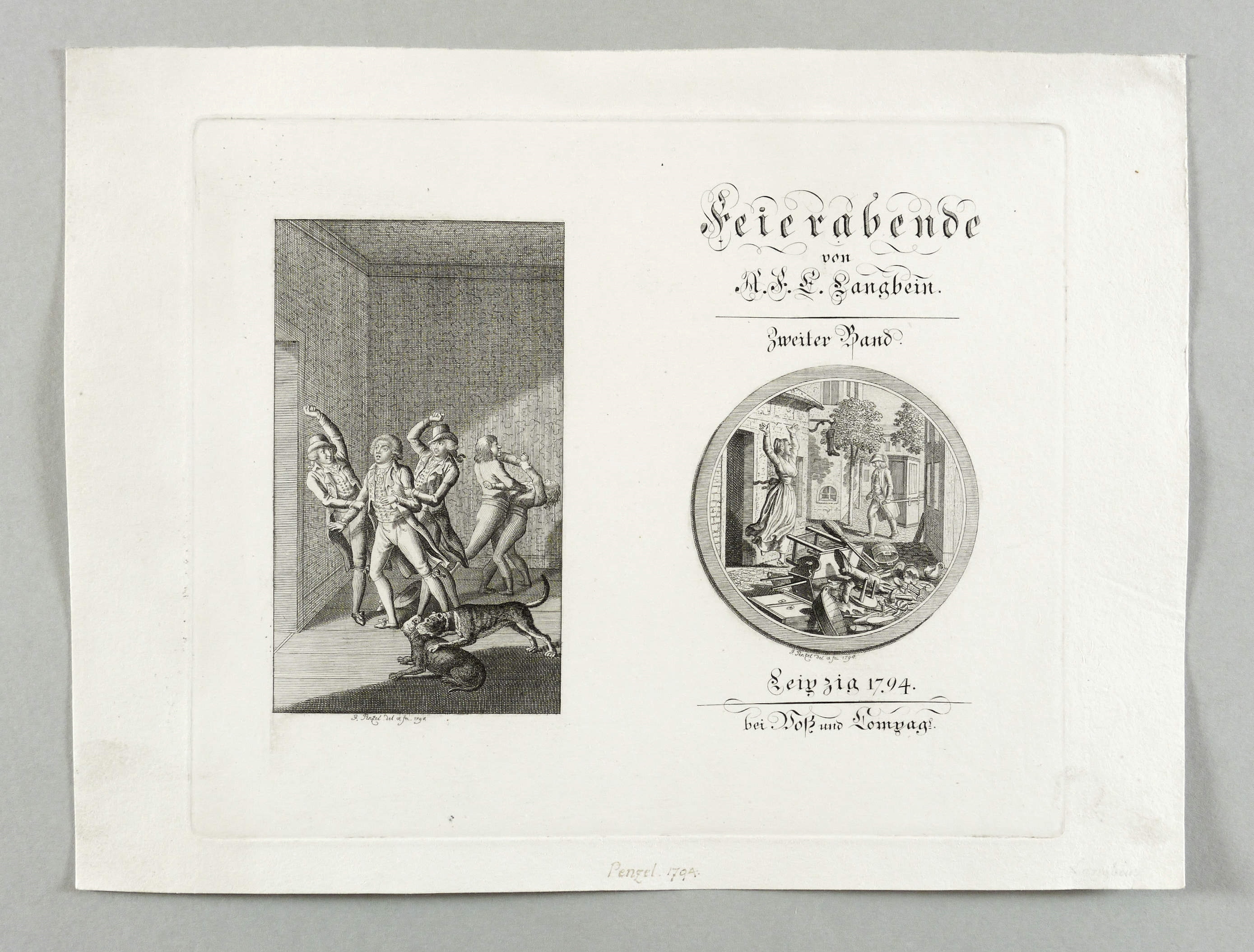 Aus: August Friedrich Ernst Langbein, Feierabende (Leipzig: Voß & Comp. 1794). – In der Platte sowohl links als auch rechts unter den Darstellungen signiert und datiert: ″J. Penzel del. & fec. 1794.″ – Frontispiz und Titelblatt auf einer Platte zu ″Feierabende″, einer Sammlung von Märchen und Novellen von August Friedrich Ernst Langbein. – In den Blattecken geringfügig angestaubt. Sonst tadellos. Sehr guter Zustand.