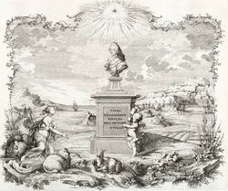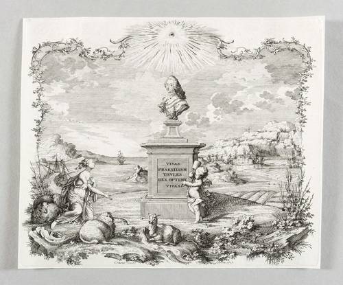 Strunk 710. – Aus: Oratorio quum Auspicatissimus Natalis Serenissimi Potentissimique Regia ... (Leipzig: Bernhard Christoph Breitkopf 1757). – In der Platte am unteren Rand signiert und datiert: ″Crusius fecit / Lipsiae 1757″. Wenig darüber weiter bezeichnet: ″Vidalinus invenit.″ Im Sockel des Denkmals Inschrift: ″VIVAS PRAESIDIUM THULES REX OPTIMAE VIVAS″. – Dieser Kupferstich erwähnt in Thieme-Becker (Bd. 8, S. 178). – Mit knappem Rändchen um die Platte. Sauber und frisch wirkend. Insgesamt guter Erhaltungszustand.