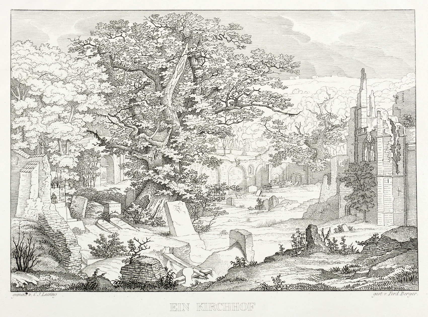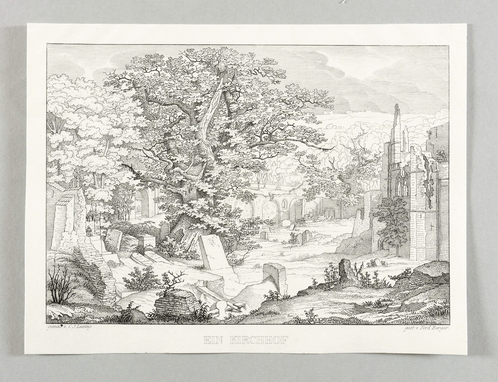 In der Platte rechts unten signiert: "gest. v. Ferd. Berger." Unterhalb betitelt und bezeichnet: "EIN KIRCHHOF". – Wiedergabe des Gemäldes "Kirchhof mit Leichensteinen und Ruinen im Schnee" von 1825, mit dem Carl Friedrich Lessing auf der Kunstausstellung der Berliner Akademie Aufsehen erregte und einen hohen Preis erzielte. – In der Platte beschnitten. Sonst tadellos. Guter Zustand.