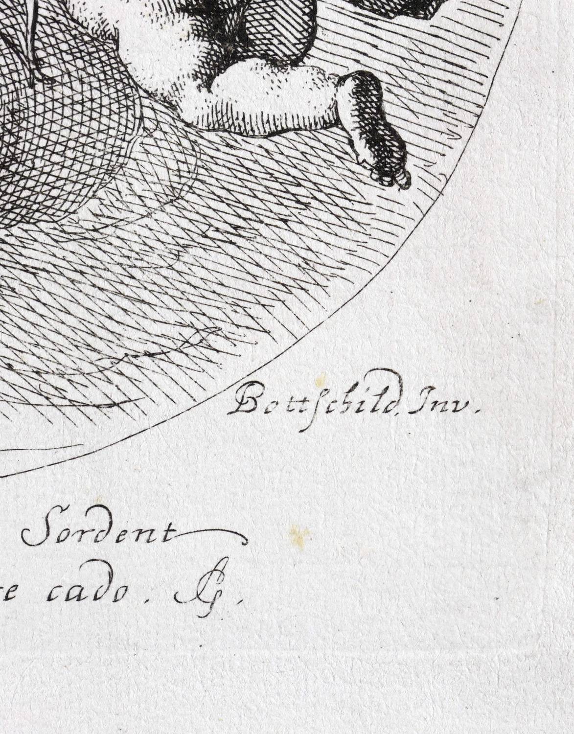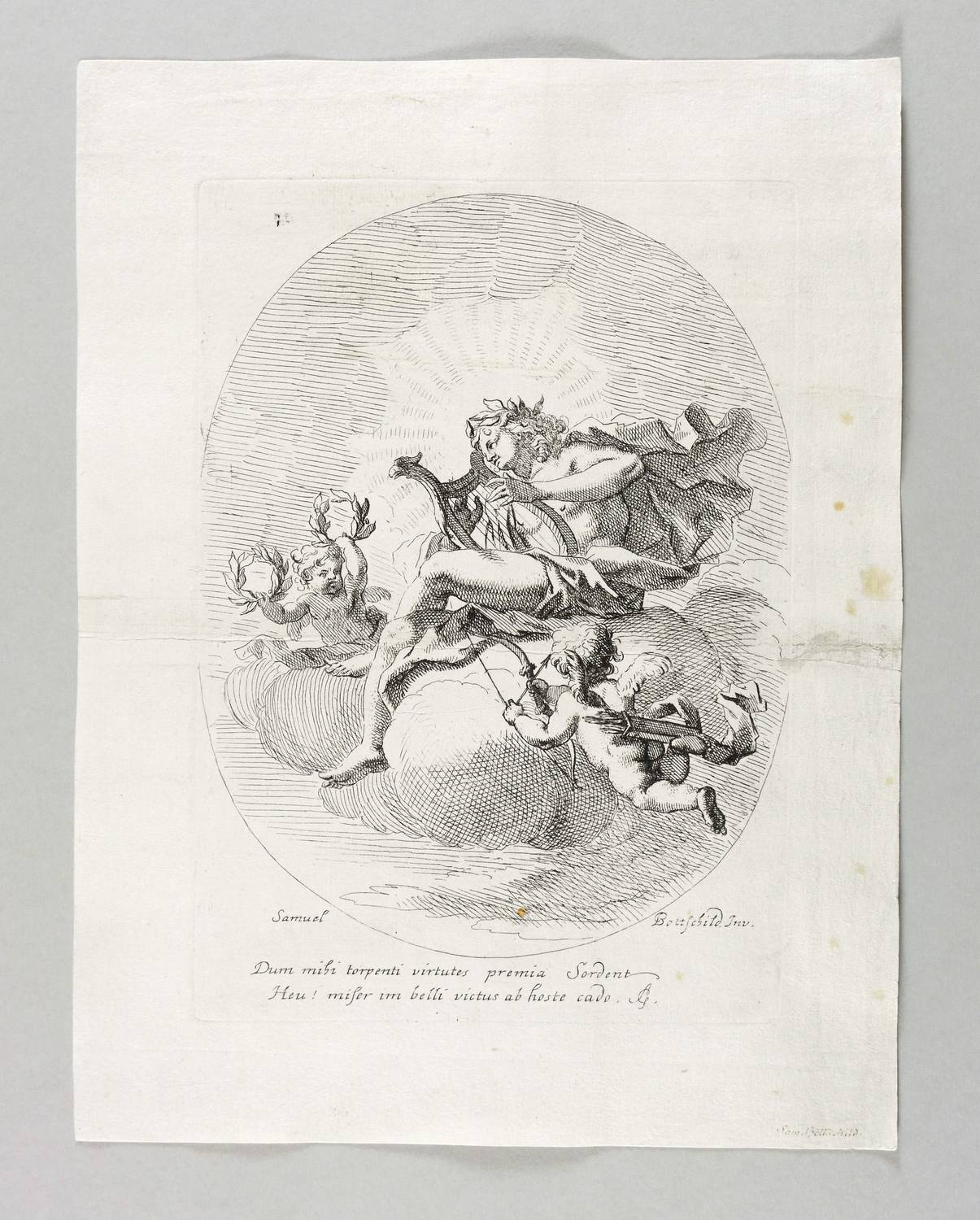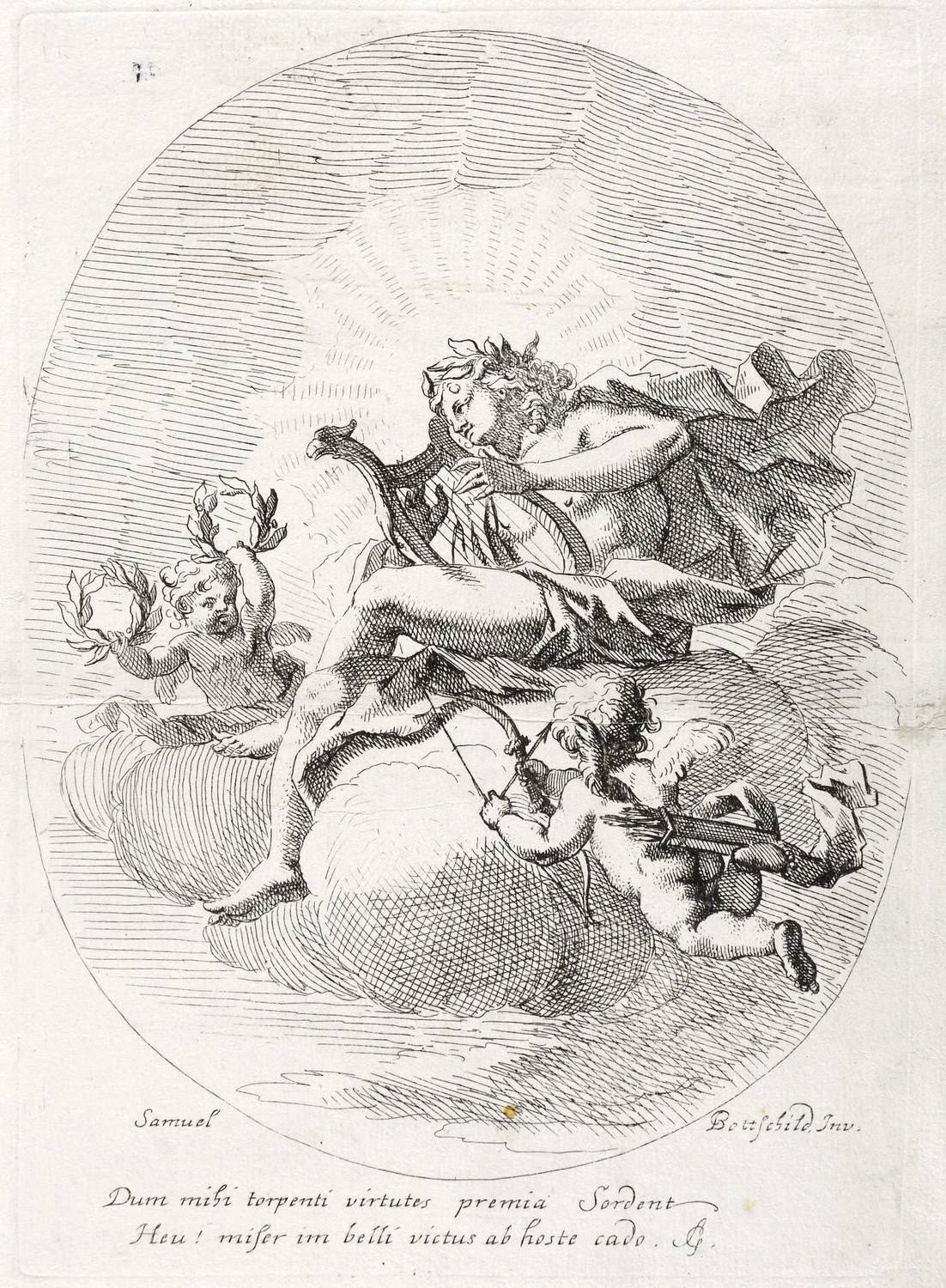 In der Platte links und rechts unten signiert: ″Samuel Bottschild Inv.″ Darunter die Inschrift: ″Dum mihi torpenti virtutes premia Sordent / Heu! miser im belli victus ab hoste cado. SG.″ In der rechten unteren Blattecke zusätzlich in brauner Feder bezeichnet: ″Sam. Bottschild.″ – Komposition im Medaillon mit dem auf einer Wolke sitzenden Sonnengott, von einer Licht- Gloriole hinterfangen, die Kithara (Leier) spielend sowie von zwei Putten mit Lorbeerkränzen, Pfeil und Bogen begleitet. – Alte horizontale Knickfalte geglättet. Zwei restaurierte Randrisse. Rechts im Rand etwas fleckig.. Mäßig guter Erhaltungszustand.