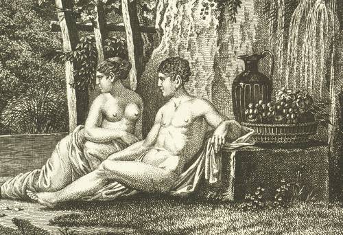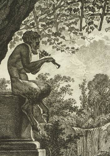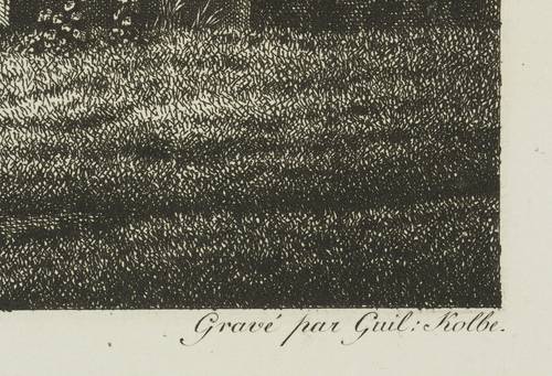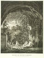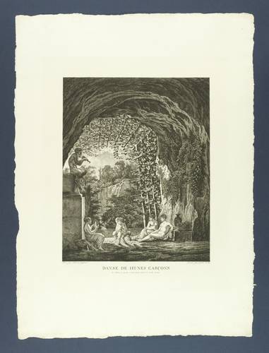 Martens 290 III (von III). Jentsch 307 III (von III). – Aus: Carl Wilhelm Kolbe d. Ä., Collection des Tableaux en Gouache et des Dessins de Salomon Gessner (Zürich: Salomon Gessner 1806-1811). – In der Platte rechts unten signiert: "Gravé par Guil: Kolbe." – Im Werkverzeichnis von Martens beschrieben als: "Das Innere einer Grotte. Links sitzt auf hohem Säulenpostament ein Flöte blasender Faun. In der Mitte tanzen ein Knabe und ein kleiner Faun; rechts ein Jüngling und zwei Frauen." – Originalrandiges Blatt. Von allerbester Erhaltung.