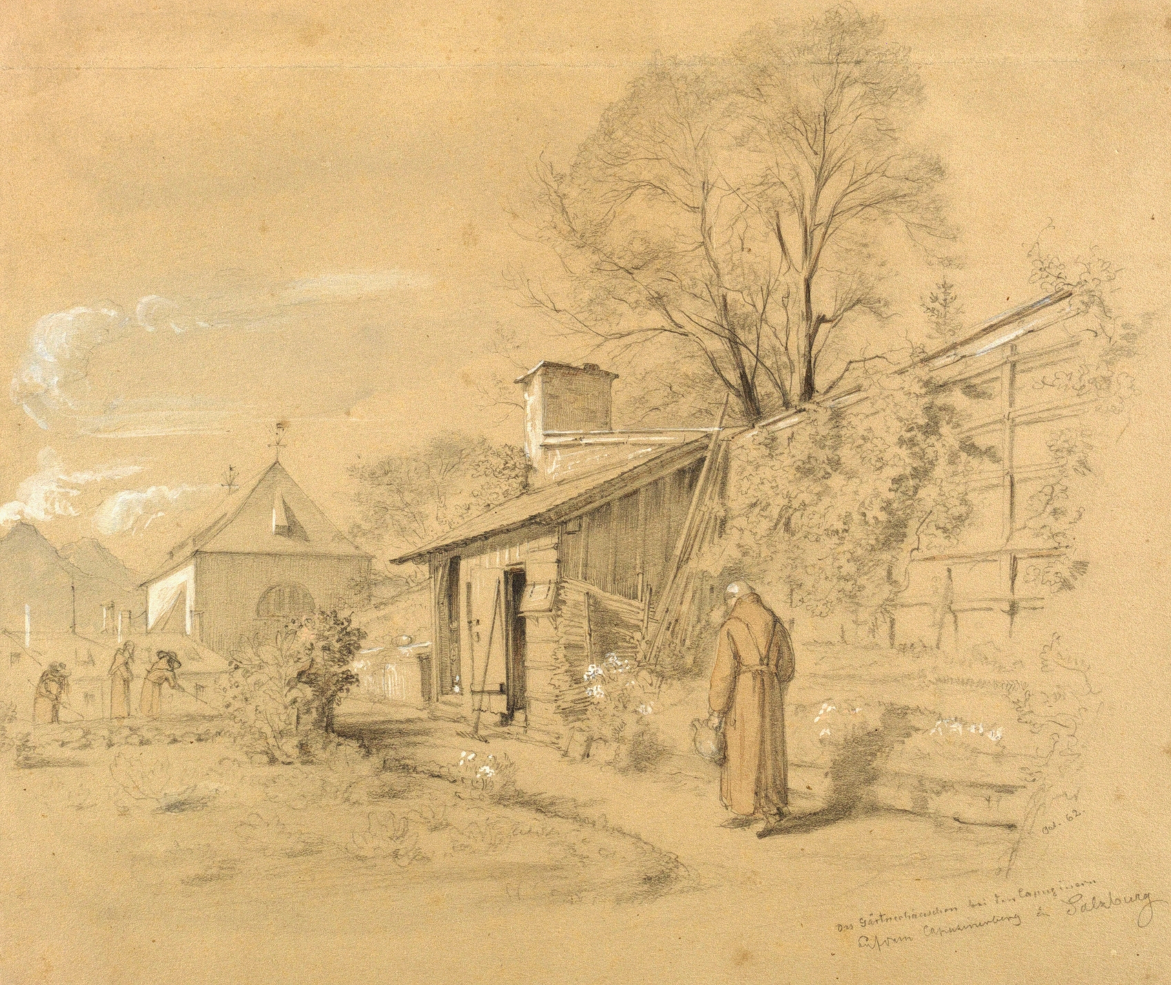 Rechts unten in Bleistift eigenhändig datiert und bezeichnet: ″Oct. 62 // Auf dem Capuzinerberg zu Salzburg″. Über dem Titel etwas jünger hinzugesetzt: ″Das Gärtnerhäuschen bei den Capuzinern″. Verso Nachlass-Stempel mit Malpalette und Inschrift: ″KUNST-NACHLASS W.A. Beer″. Handschriftliche Nummer: ″836″. – Oben parallel zur Blattkante Knickspur. Rückseitig Montagereste. Stellenweise etwas fleckig. Insgesamt mäßig guter Zustand.