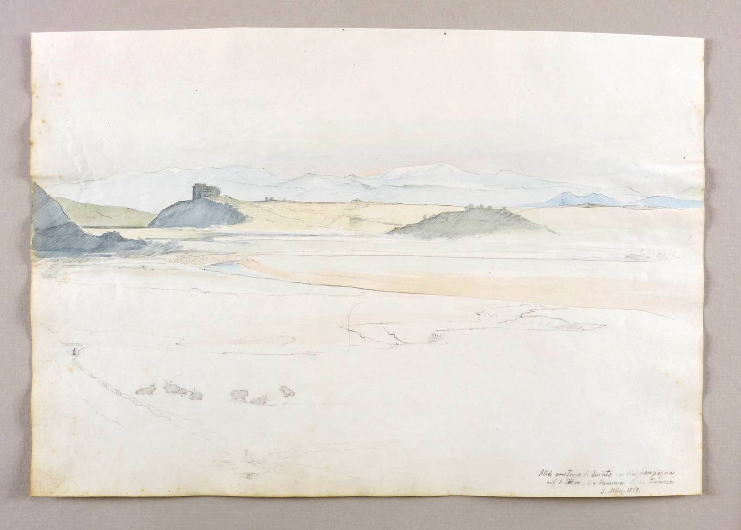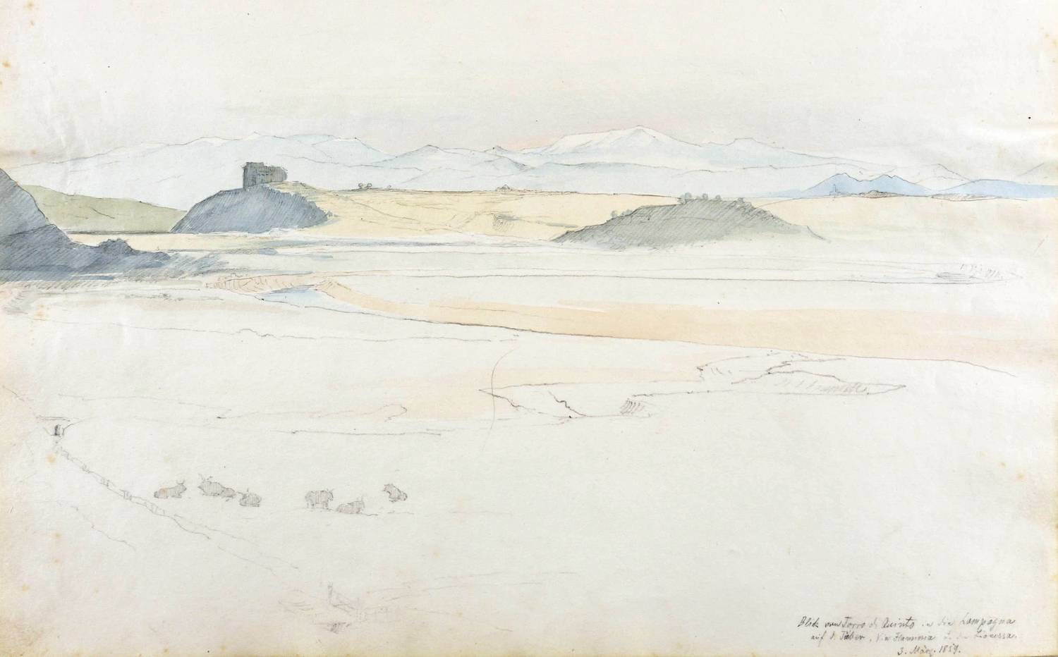 Rechts unten in Bleistift bezeichnet und datiert: ″Blick von Torro di Quinto in die Campagna auf d. Tiber, Via Flammia u. die Lionessa. 3. März. 1859.″ – Aus dem Skizzenbuch eines deutschen wohl spätromantischen Künstlers von einer Italienreise der Jahre 1858/59 mit zahlreichen Veduten und Wiedergaben alter Meister. – In den Blatträndern minimal fleckig. Guter Zustand.