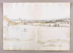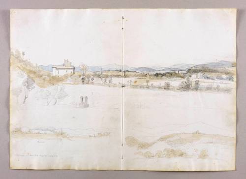 Links unten in Bleistift bezeichnet und datiert: ″Campagna vor Rom. Porta Angelica. I. May. 1859.″ – Doppelseite aus dem Skizzenbuch eines deutschen wohl spätromantischen Künstlers von einer Italienreise der Jahre 1858/59 mit zahlreichen Veduten und Wiedergaben alter Meister. – Minimal fleckig. Mittig vertikale Bindefalte mit Spuren der Fadenheftung. Guter Zustand.