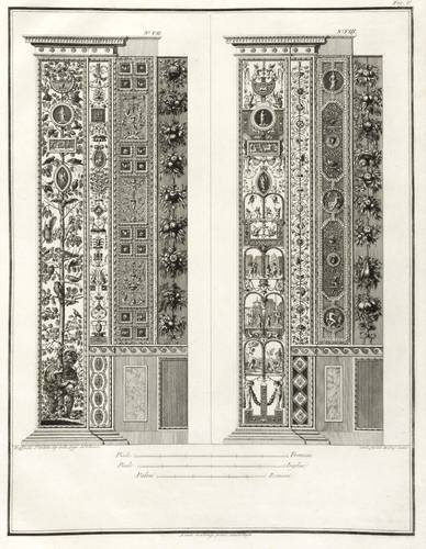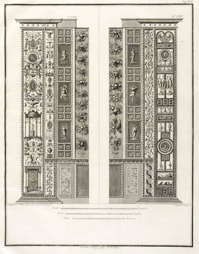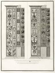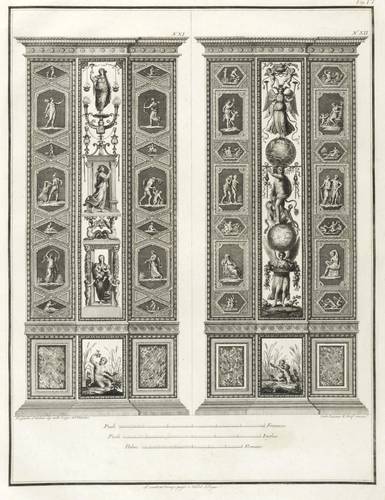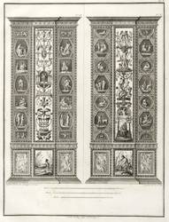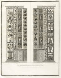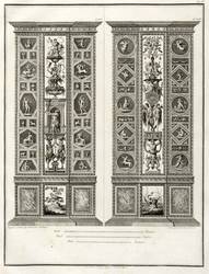 Höper G 21.35/36 (Kopie). – Aus: Carlo Lasinio, Logge del Vaticano (Florenz: Niccolo Pagni 1802). – Titelblatt oben bezeichnet: ″LOGGE DEL VATICANO″, links und rechts unten signiert: ″Luca Comparini disegnò // Giov: Balzar incise / Frañco: Rainaldi diresse″, darunter in zwei Spalten um zwei Putti mit Wappen bezeichnet: ″A SUA ECCELL:ZA IL SIG. BARONE ERMANNO DE SCHUBART / Cav: dell’ Ordine di Dannebrogue Ciamber:no di S.M. il Re di Danimarca / Suo Inviato Straordinario e Ministro Plenipotenziario / presso S.M. il Re delle Sue Sicilie / Intendente Generale delle Relazioni Commerciali della Danimarca / nei porti d’Italia″, rechts darunter: ″Francesco Rainaldi D.D.D.″ sowie unter der Umrandung: ″In Firenze appo: Niccolò Pagni dall’Albergo dell’Aquila Nera″. Die einzelnen Tafeln meist rechts unten signiert: ″Carlo Lasinio R. Prof. inc.″ Tafel Nr. X mit Jahreszahl: ″1802″. – Vollständige Folge des Prachtwerks mit allen 14 Blättern, einem Frontispiz und 13 Tafeln, jeweils Doppeldarstellungen der Pilaster der Loggien-Freskierung von Raffael. Vorbild waren die berühmten ″Loggie di Rafaele nel Vaticano″ (1777) von Giovanni Volpato und Giovanni Ottaviani. (Vgl. Corinna Höper, Wolfgang Brückle, Udo Felbinger, Raffael und die Folgen. Das Kunstwerk in Zeitaltern seiner graph. Reproduzierbarkeit, Stuttgart 2001, S. 478 ff, G 21). – Ohne Einband. Blätter unbeschnitten und originalrandig. Die Tafeln außer dem Titelblatt mit Bindungsspuren bzw. noch zusammengeheftet. Die Blätter meist leicht stockfleckig und mit geringen Altersspuren, selten etwas randrissig, fingerfleckig oder stärker stockfleckig. Insgesamt mäßig guter Zustand.