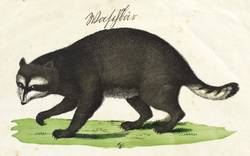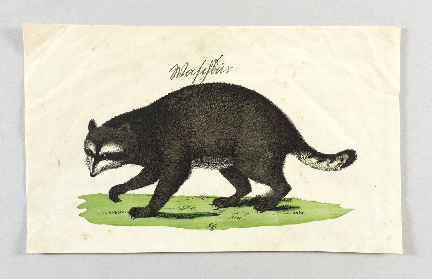 Aus: Naturgeschichte der Säugethiere in Bildern. treu theils nach d. Natur, theils nach d. ausgezeichn. zoolog. Bildersammlungen gez., fein u. getreu color. zum Anschauungsunterricht für d. Jugend [...] (Eßlingen & Stuttgart: Schreiber & Schill 1854). – Über der Darstellung bezeichnet ″d″ und darunter in schwarzer Tusche betitelt. – Papier leicht knickspurig, etwas fleckig und angeschmutzt. Stark beschnitten. Noch gut erhalten.
