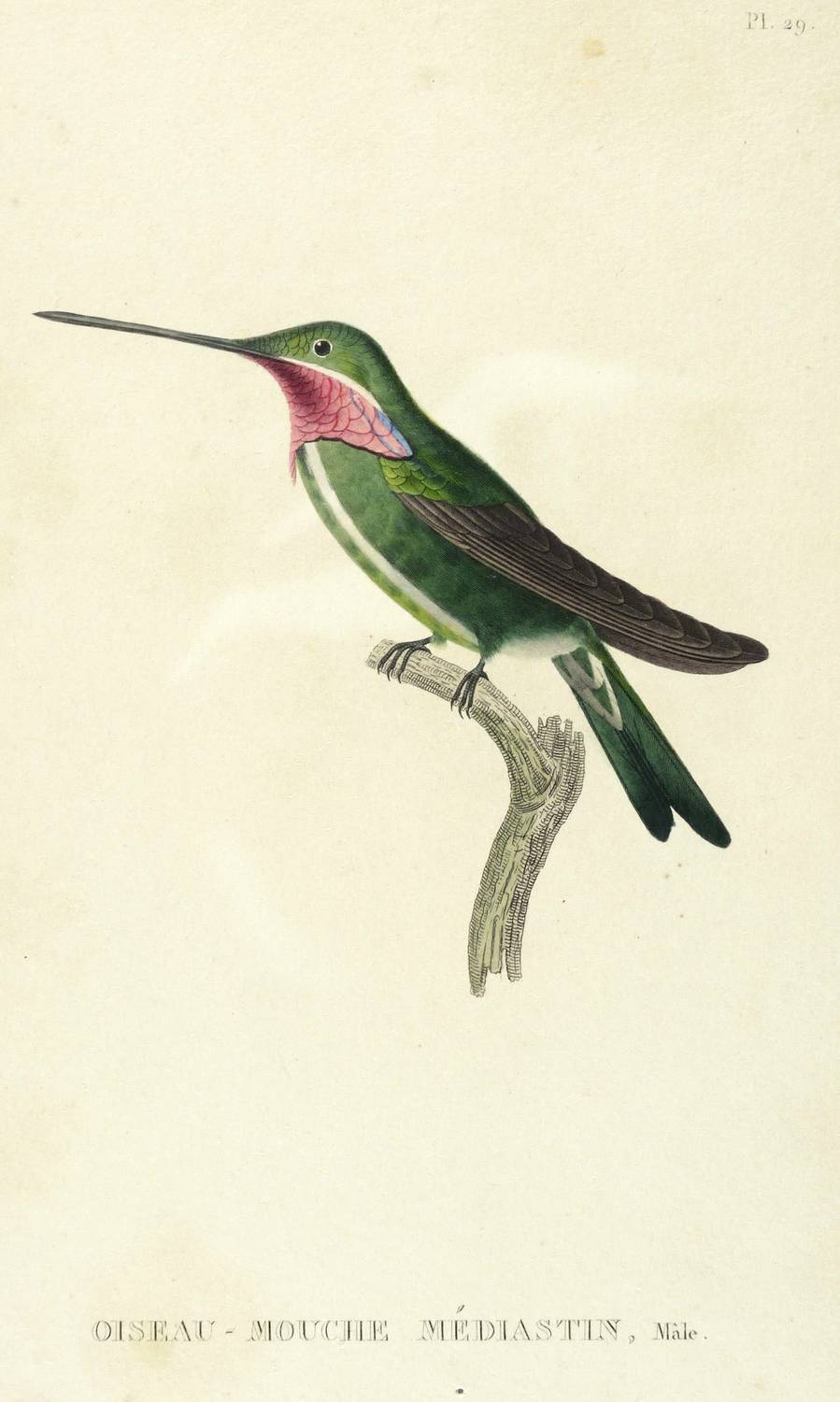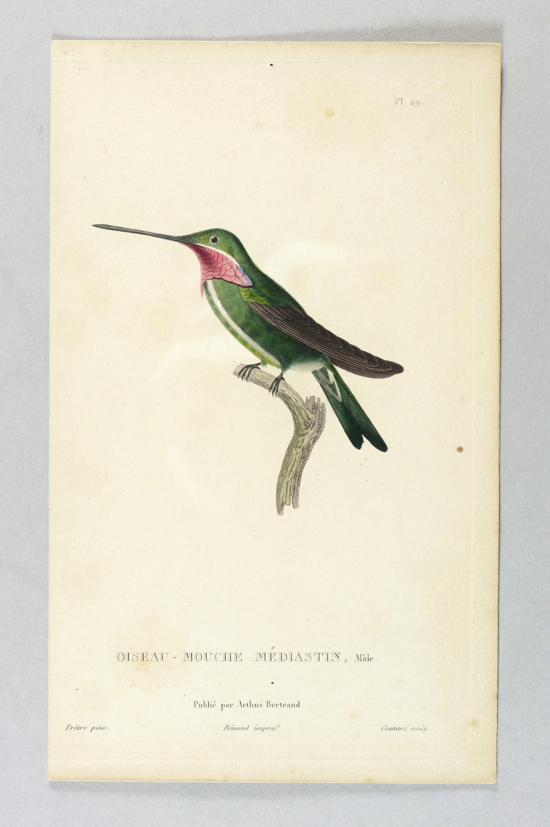 Anker 291. Nissen IVB 547. – Aus: René Primevère Lesson, Histoire naturelle des oiseaux-mouches (Paris: Arthus Bertrand 1829-1830). – Rechts unten signiert: ″Coutant sculp.″ Unterhalb der Darstellung betitelt. – Partiell unscheinbar fleckig. Sonst guter Zustand.