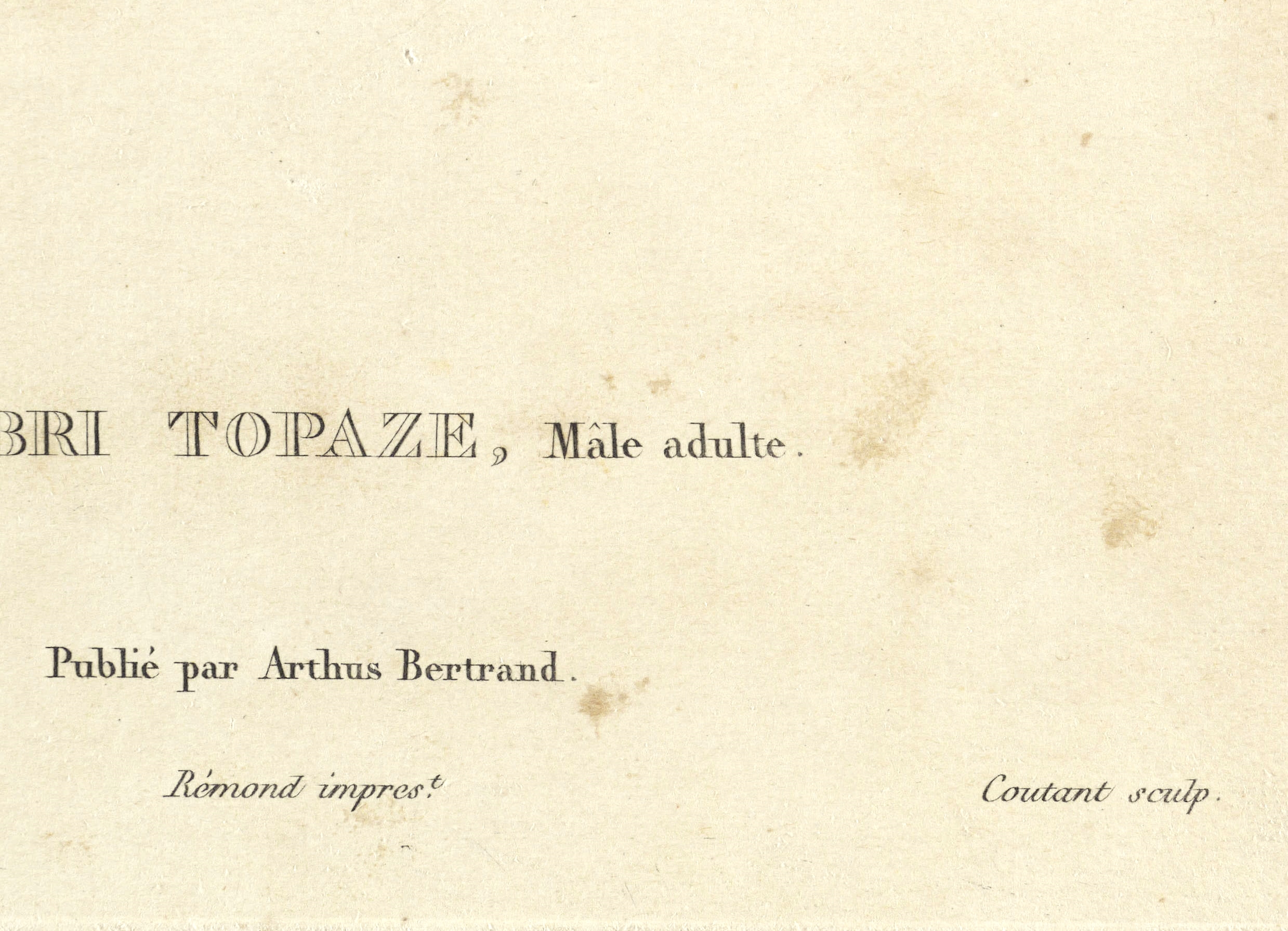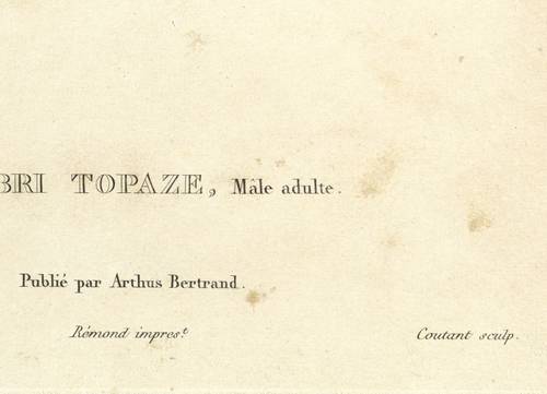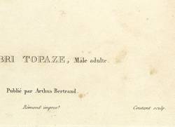 Aus: René Primevère Lesson, Histoire naturelle des oiseaux-mouches (Paris: Arthus Bertrand 1829-1830). – Rechts unten signiert: ″Coutant sculp.″ Unterhalb der Darstellung betitelt. – Partiell unscheinbar fleckig. Sonst guter Zustand.