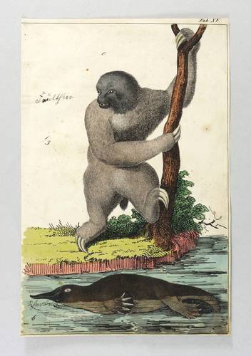 Aus: Naturgeschichte der Säugethiere in Bildern. treu theils nach d. Natur, theils nach d. ausgezeichn. zoolog. Bildersammlungen gez., fein u. getreu color. zum Anschauungsunterricht für d. Jugend [...] (Eßlingen & Stuttgart: Schreiber & Schill 1854). – Jeweils oberhalb der Darstellung mit schwarzer Tusche bezeichnet. – Papier leicht fleckig und teils gebräunt. Stark beschnitten. Noch guter Zustand.
