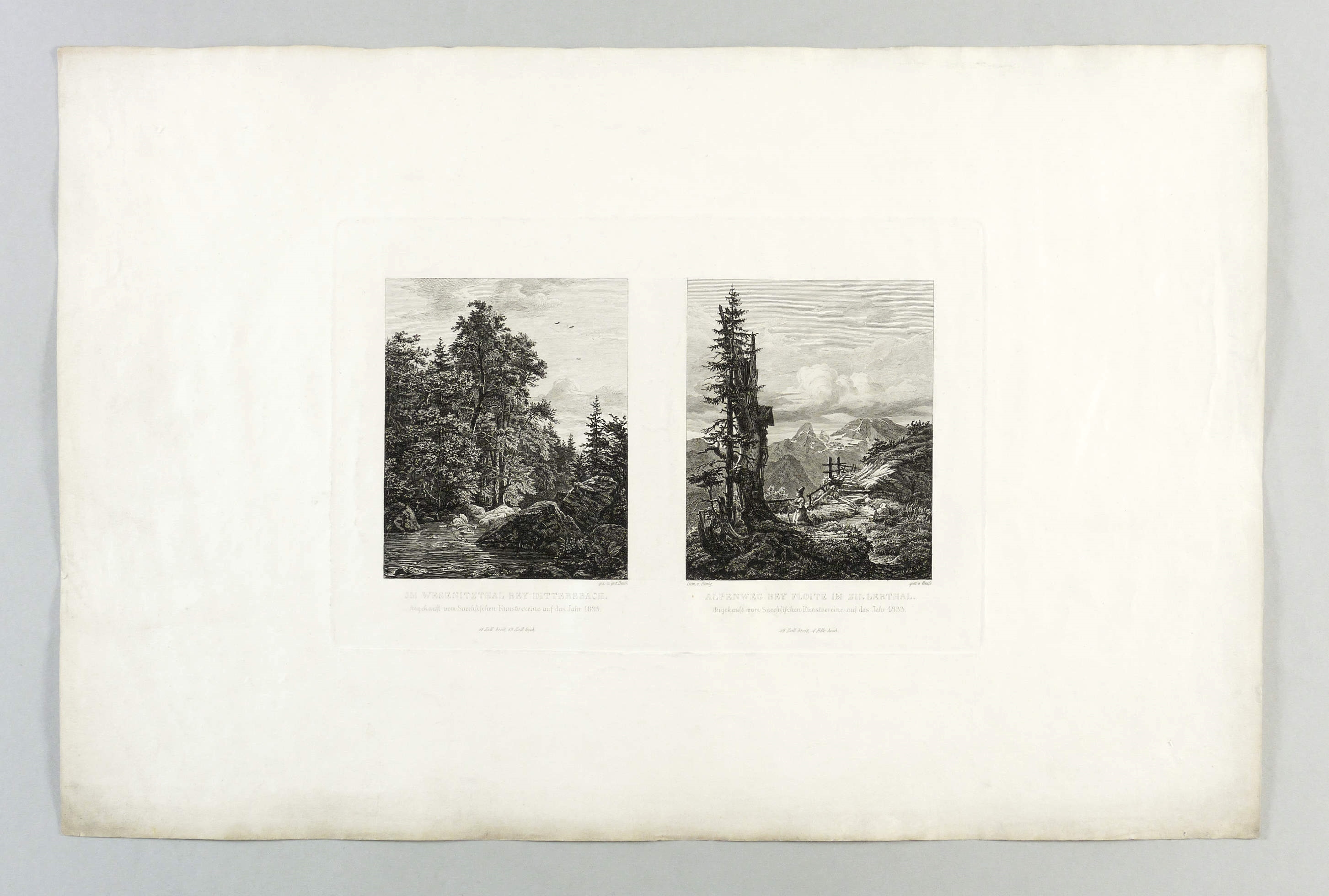 1833. Kupferstich / Radierung. – Landschaftsdarstellung, von Georg Heinrich Busse. – 34,5 x 52,5 cm (Blatt), 13,1 x 10,6 cm (Darstellung / erste), 13,1 x 10,6 cm (Darstellung / zweite), 18,7 x 28,3 cm (Platte).