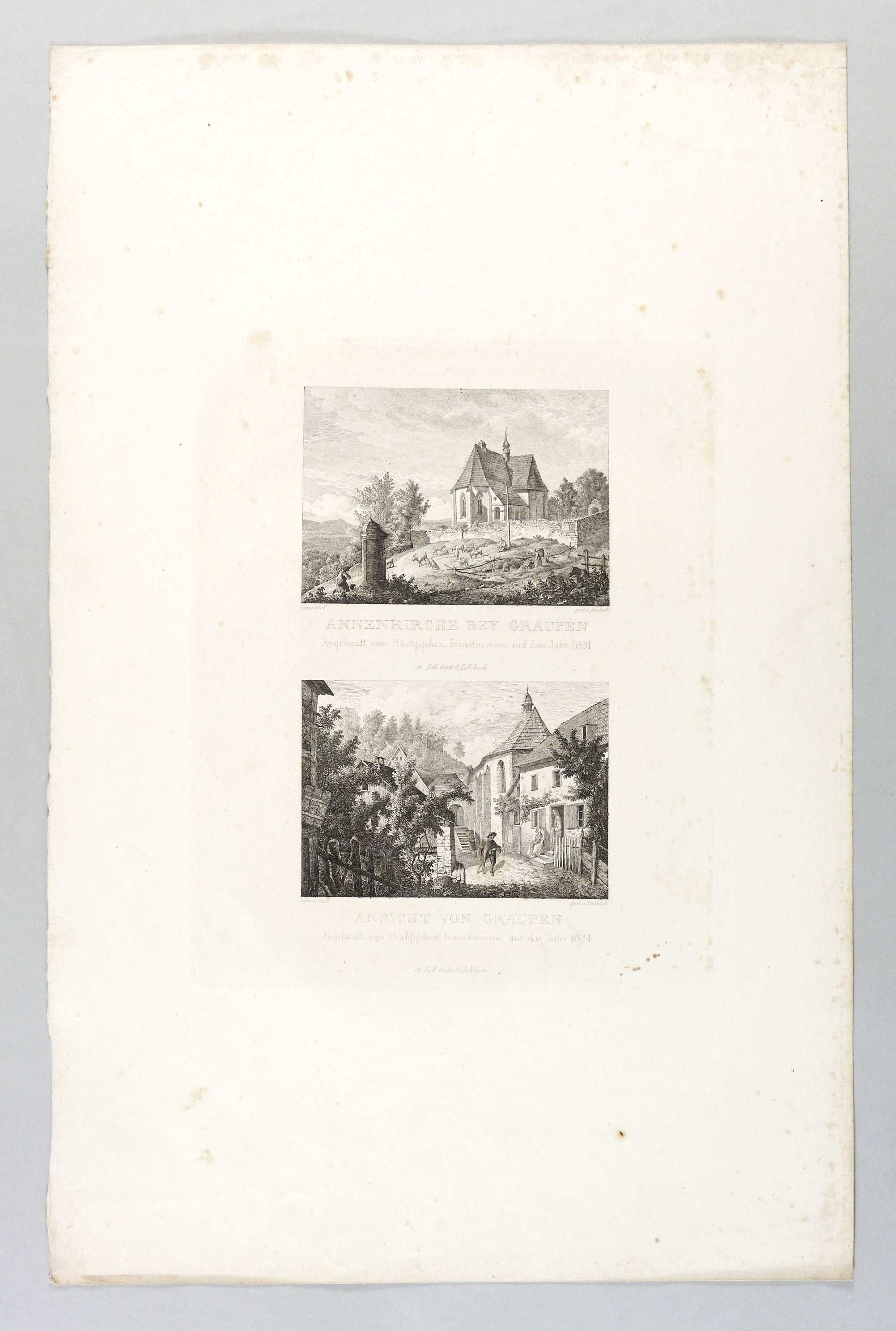 Kozakiewicz B-C 62a. Kovalevski B-C 62b. – Aus: Bilderchronik des Sächsischen Kunstvereins (Dresden: Sächsischer Kunstverein 1828-1836). – Jeweils rechts unterhalb der Darstellung signiert und direkt unterhalb betitelt und bezeichnet. – Zwei Darstellungen von einer Platte. – Blatt vereinzelt leicht fleckig. Sonst aber guter Zustand.
