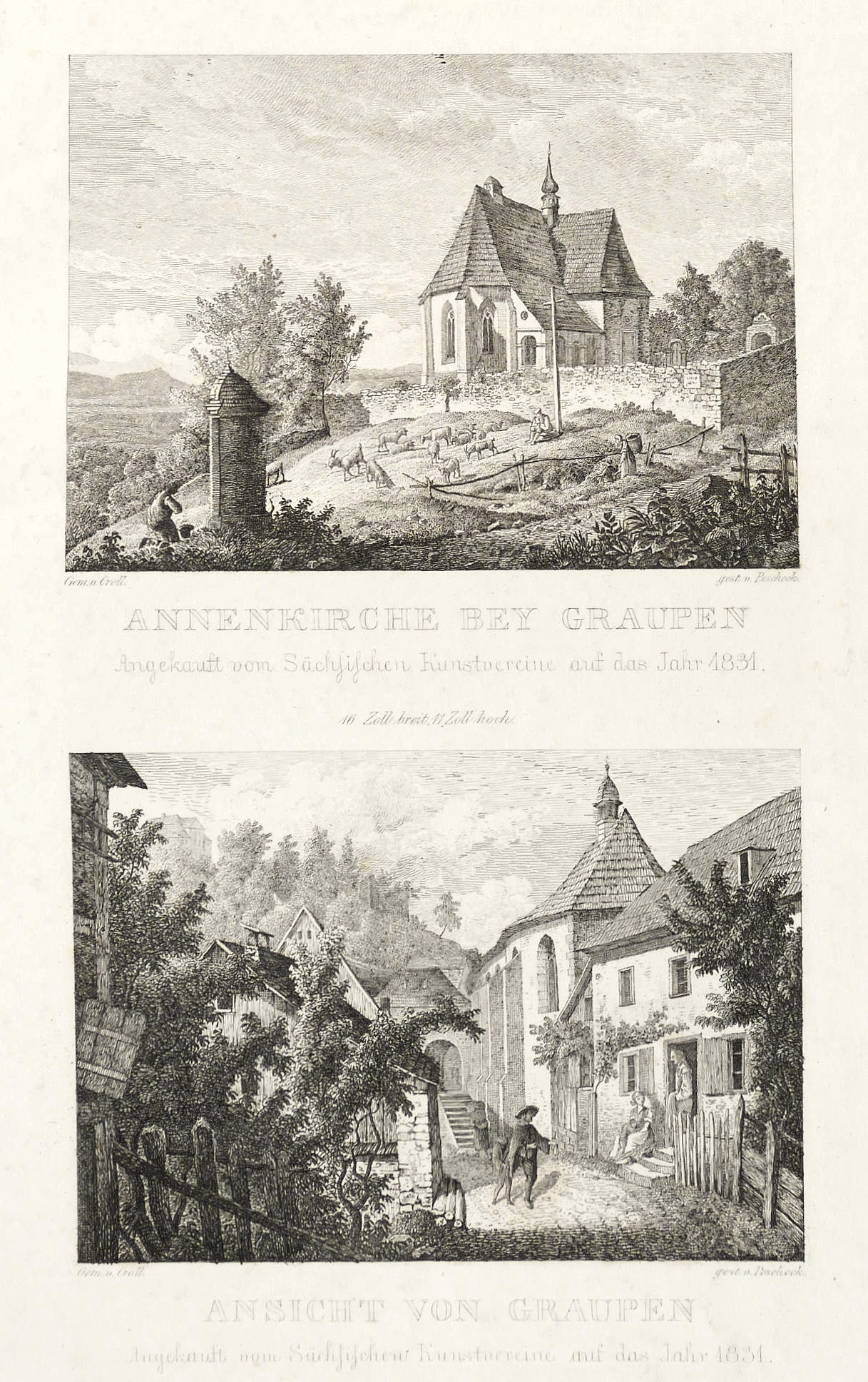 Pescheck, Carl. – „Annenkirche bey Graupen. Ansicht von Graupen”.