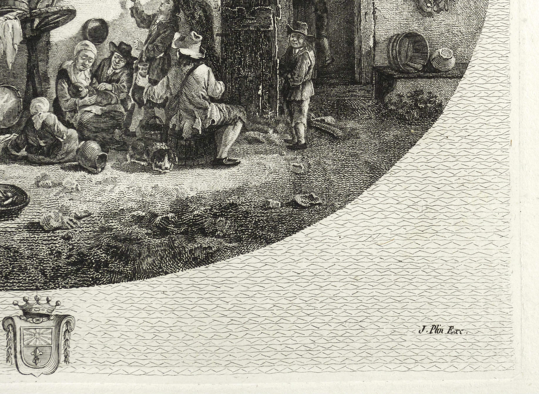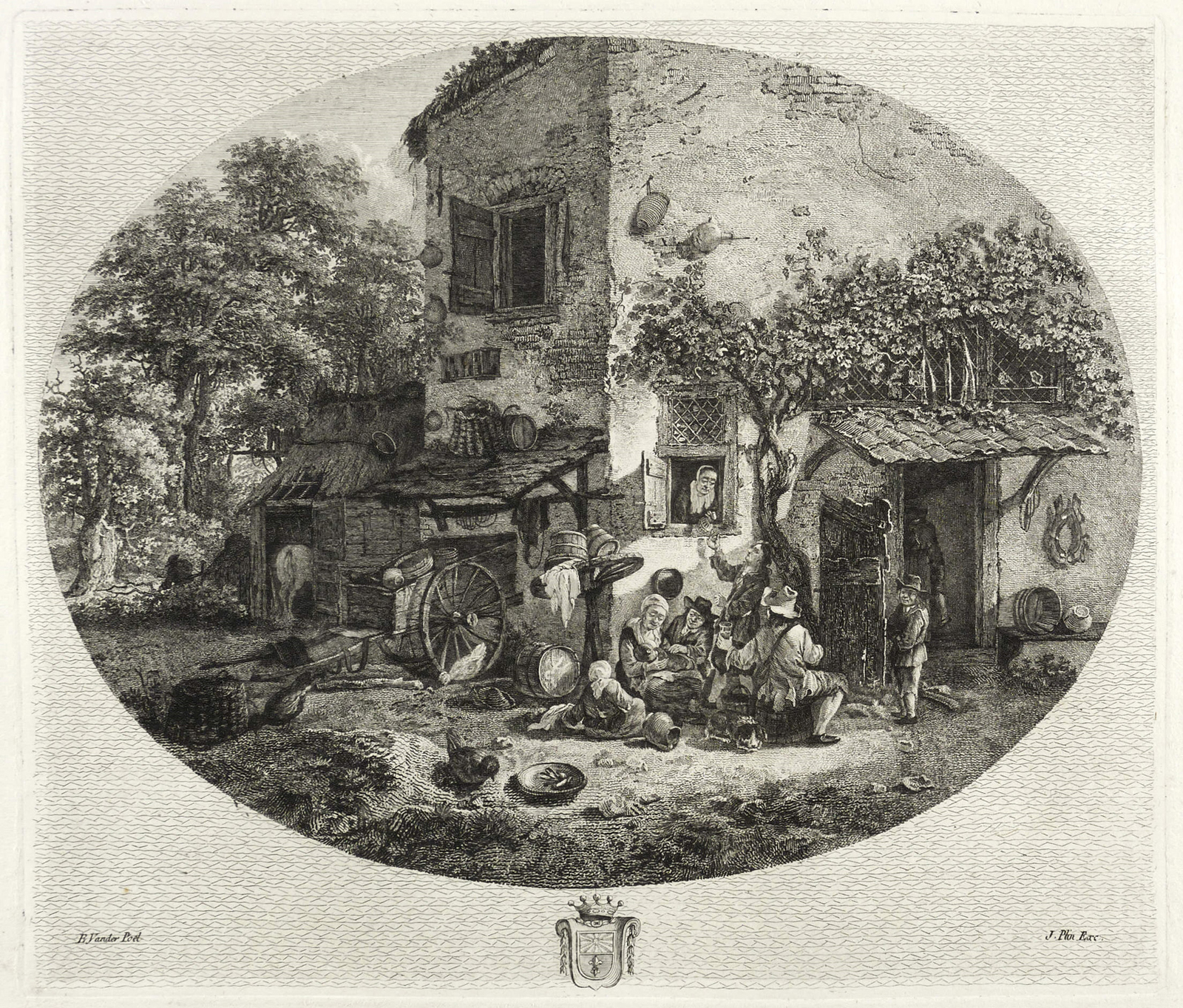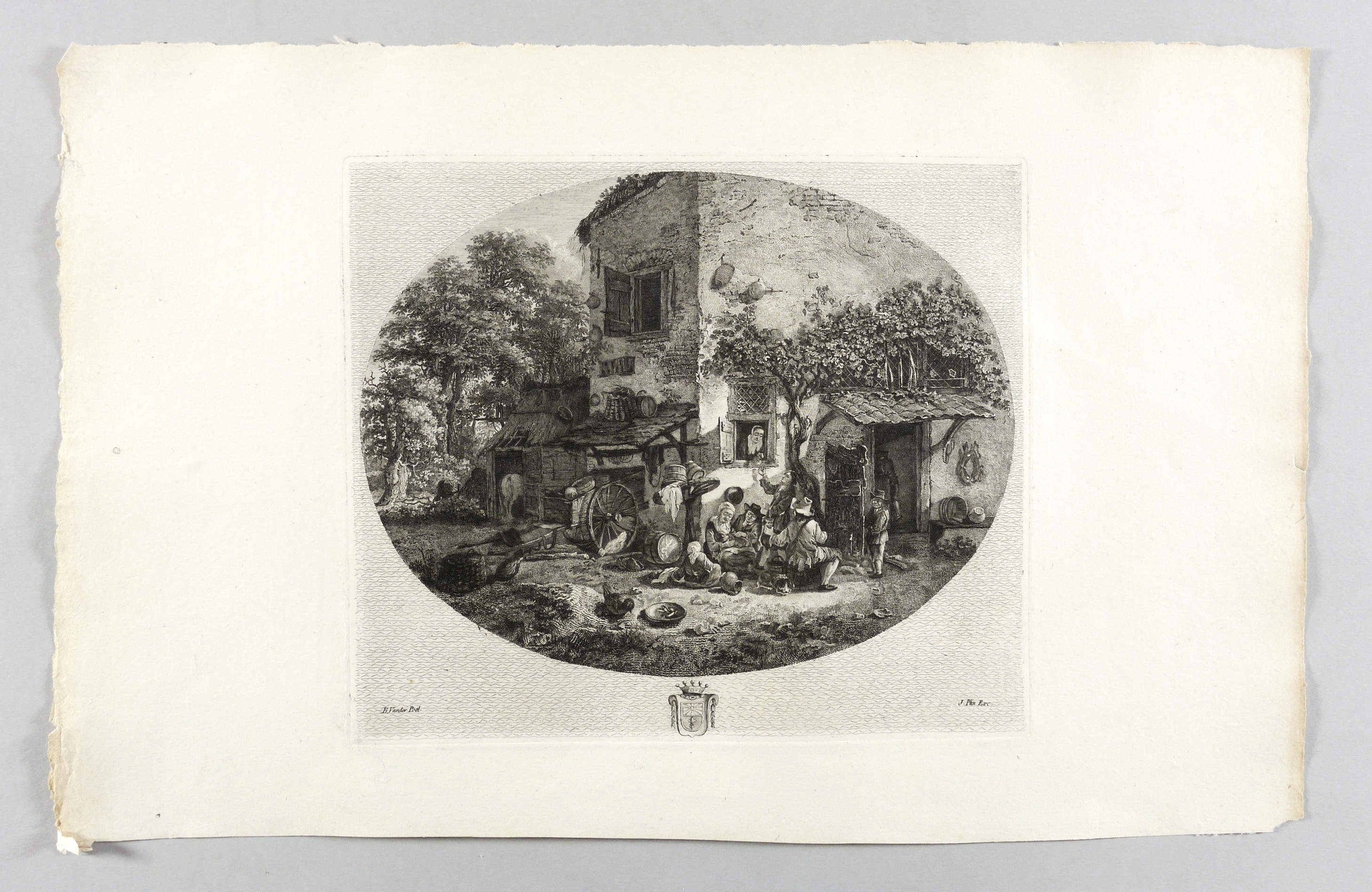 Aus: Jean-Baptiste-Pierre Lebrun, Galerie des peintres flamands, hollandais et allemand (Paris: Jacques-François Chéreau 1792-1796). – Rechts unten bezeichnet: ″J. Plin Exc.″ – Früher Abzug vor der Schrift: ″Tiré du Cabinet de Mr. le Brun. D'après le Tableau Original Peint sur bois par Vender Heyden...″ – Originalrandiges Blatt. Kleiner Eckenausriss unten rechts. Sonst aber guter Zustand.