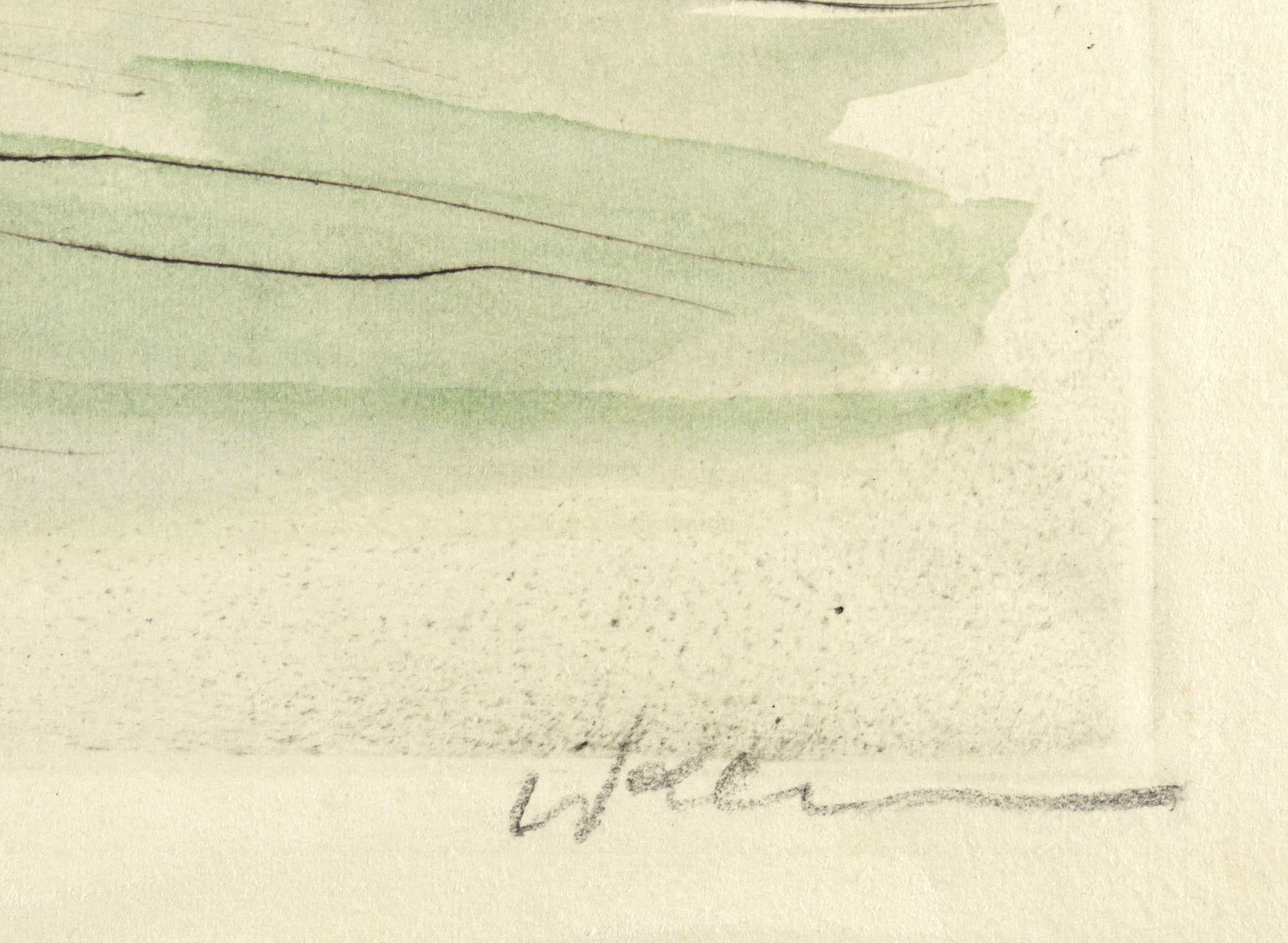 Unten rechts in Bleistift signiert, in der Mitte betitelt und links bezeichnet ″handkolorierter Probedruck″. – Blatt vereinzelt schwach fleckig und in der unteren rechten Ecke leicht knittrig. Sonst aber guter Zustand.