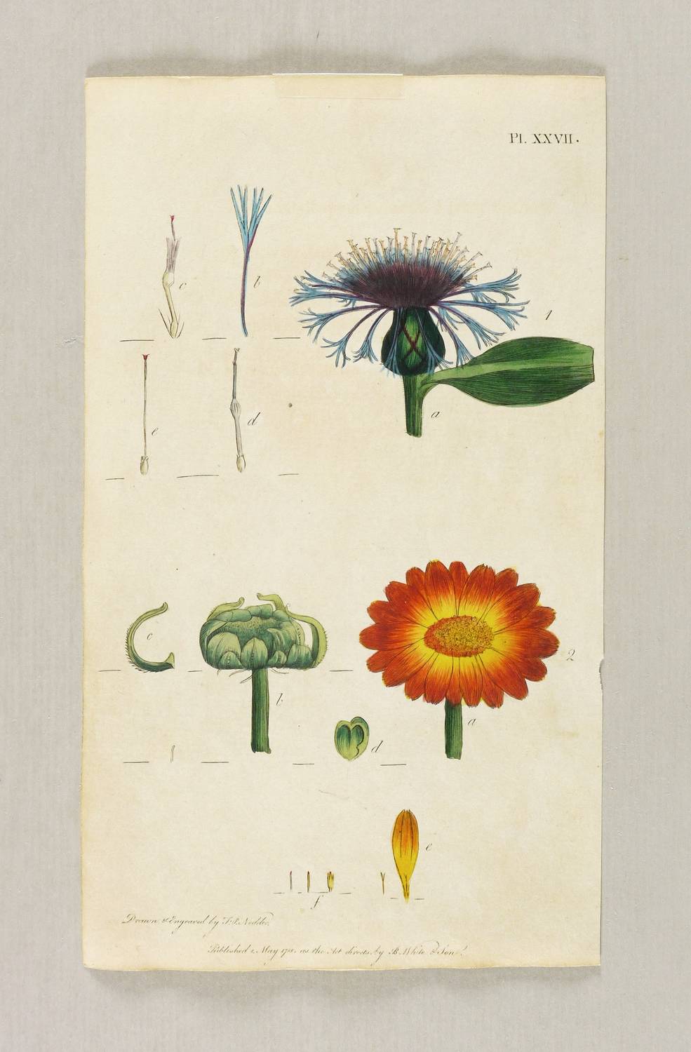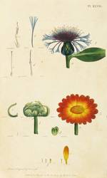 Aus: Thomas Martyn, Thirty-eight plates, with explanations. intended to illustrate Linnaeus's System of vegetables, and particularly adapted to the Letters on the elements of botany (London: J. White 1799). – Unten links signiert: ″Drawn & Engraved by F: P: Nodder.″ Darunter Verlegeradresse mit Datierung. – Berg-Flockenblume (Cyanus montanus), Synonym: Centaurea montana. - Mit Textblatt. – Guter Zustand.