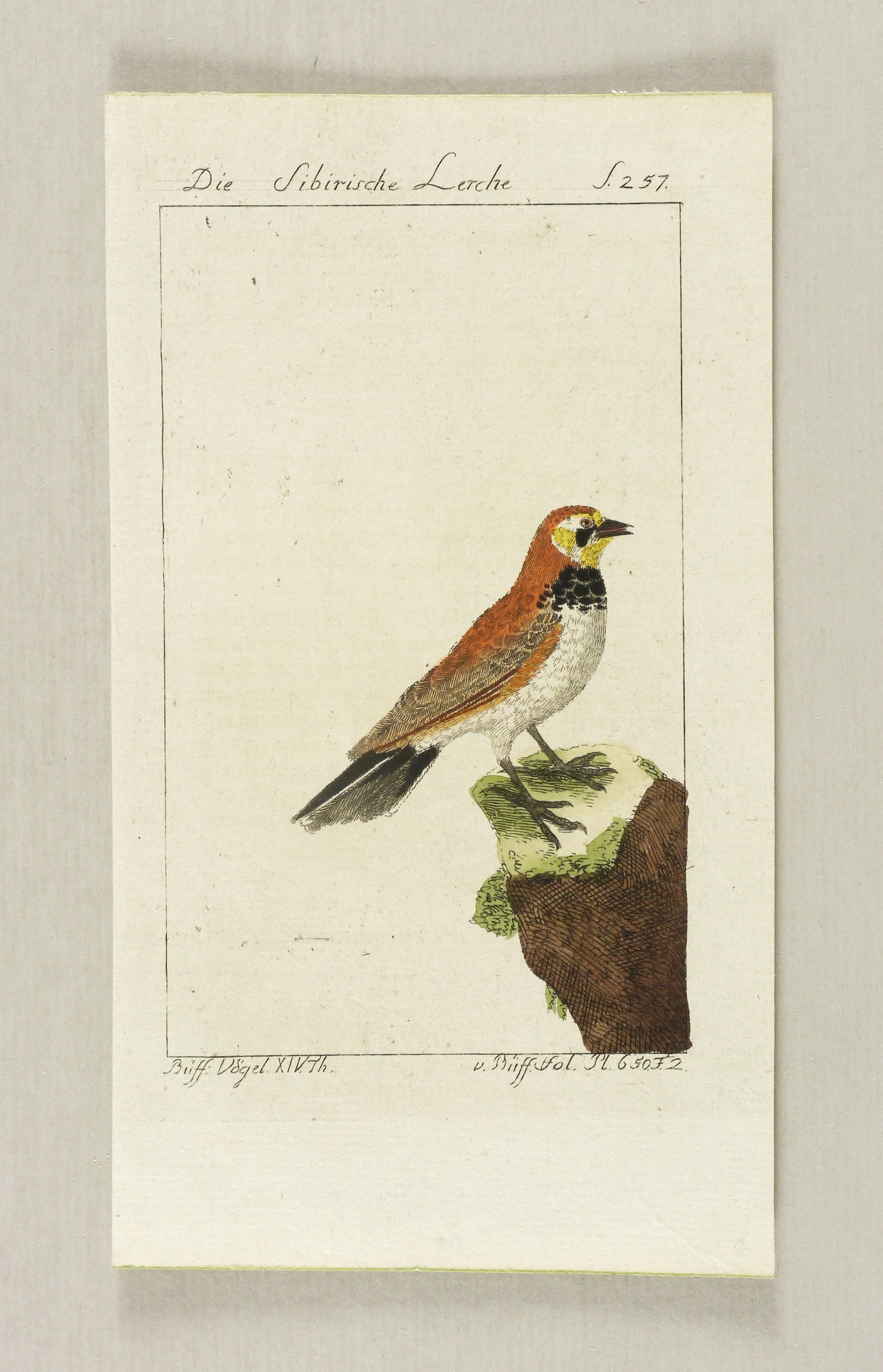 Aus: Georges Louis Le Clerc de Buffon, Herrn von Buffons Naturgeschichte der Vögel (Berlin: Joachim Pauli 1772-1826). – Oberhalb der Darstellung bezeichnet. – Womöglich handelt es sich um eine Ohrenlerche (Eremophila alpestris). – Guter Zustand.