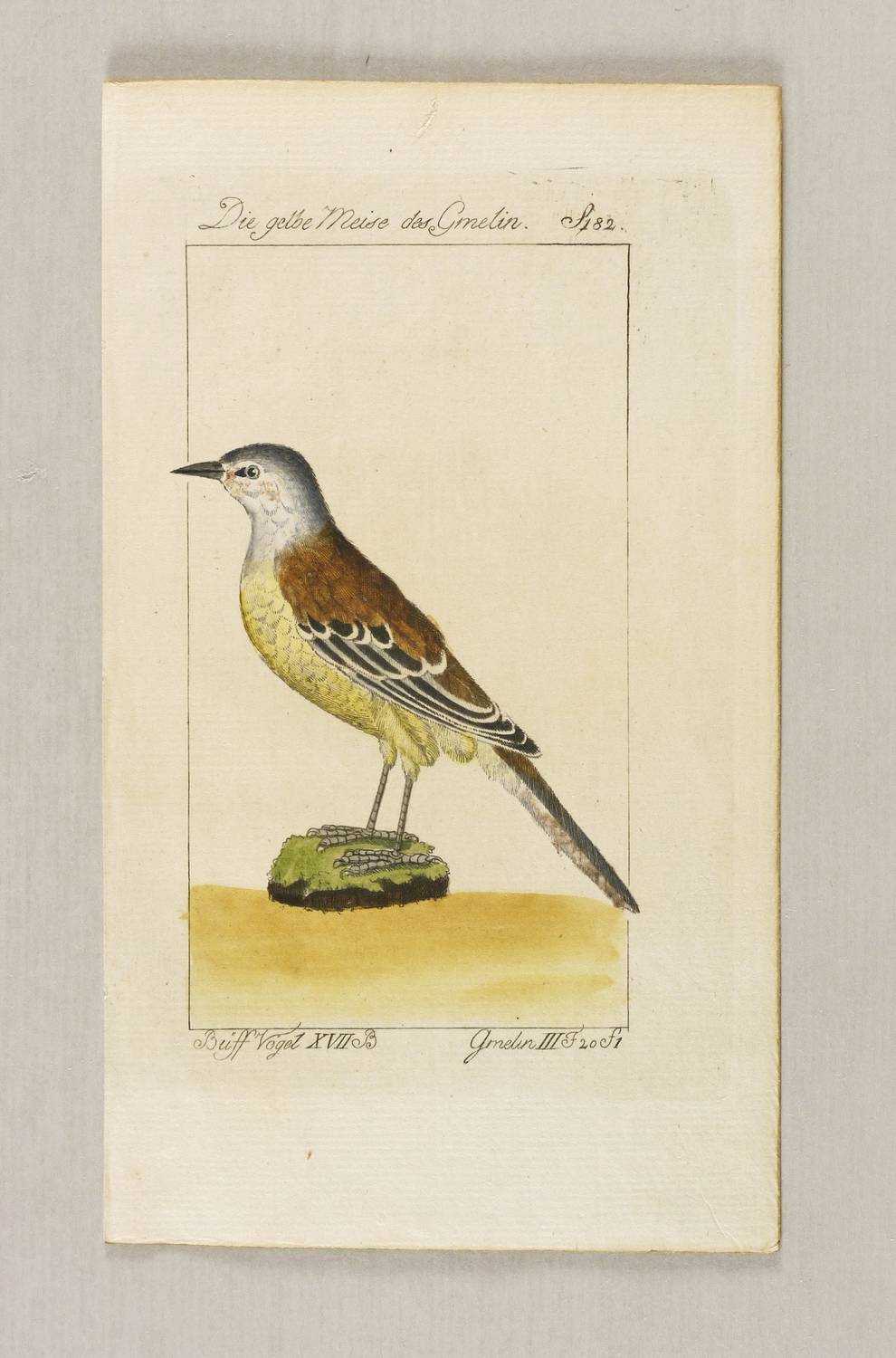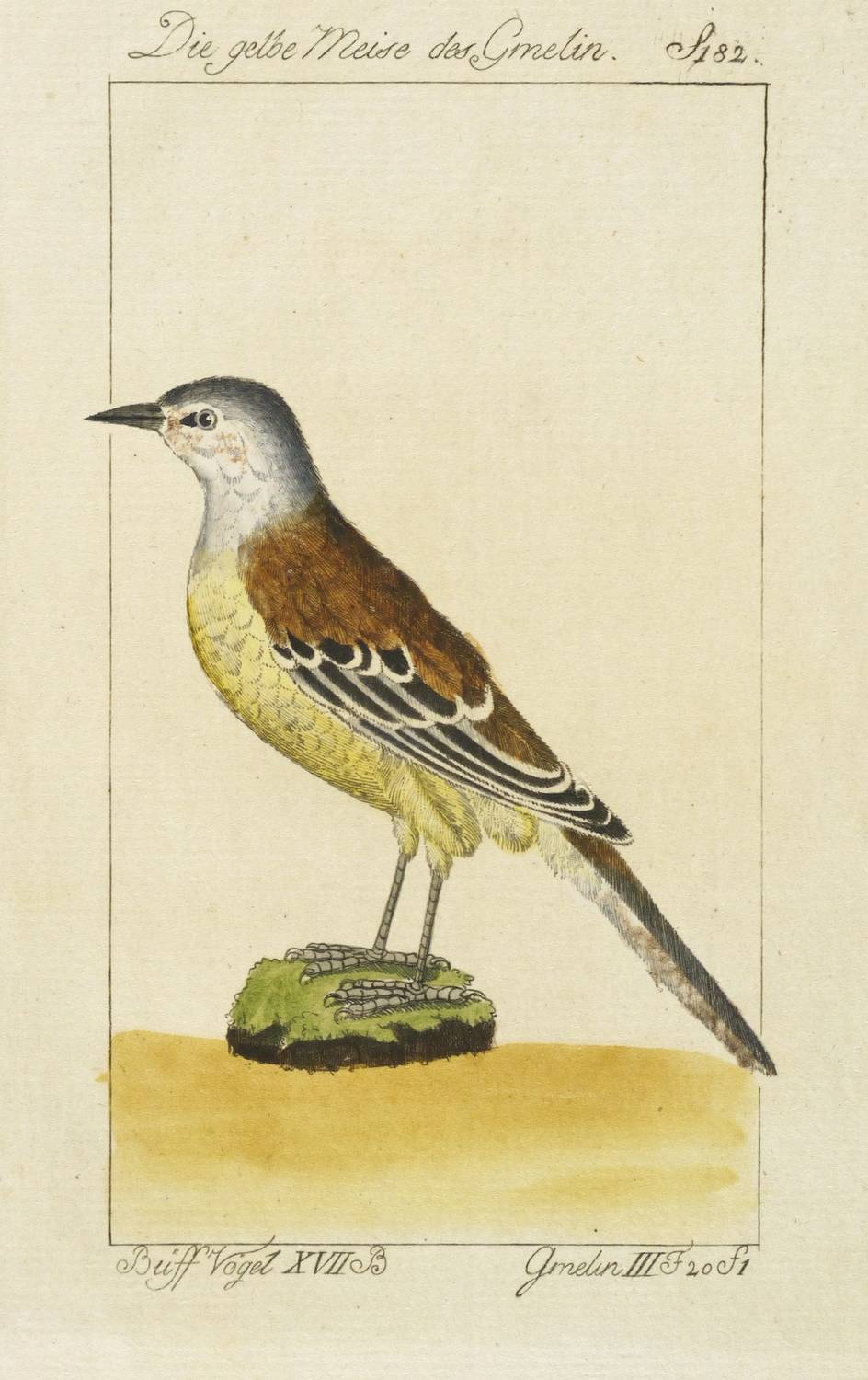 Aus: Georges Louis Le Clerc de Buffon, Herrn von Buffons Naturgeschichte der Vögel (Berlin: Joachim Pauli 1772-1826). – Oberhalb der Darstellung bezeichnet. – Gemeint ist Parus luteus, welche in Gmelins ″Reise durch Rußland zur Untersuchung der drey Natur-Reiche″ (1774) beschrieben ist. – Guter Zustand.