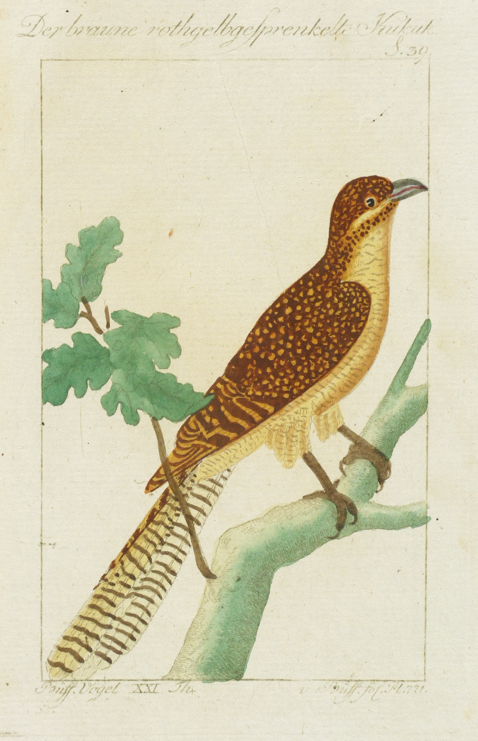 Kuckucke. – Cuculus punctatus L.. – Buffon. – „Der braune rothgelbgesprenkelte Kukuk”.