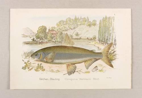 Aus: Schweizerisches Fischkochbuch. Herausgegeben bei Anlass der Züricher Fischereiausstellung Juni 1894 (Zürich: Hofer & Burger 1894). – Unterhalb der Darstellung betitelt. – Guter Zustand.