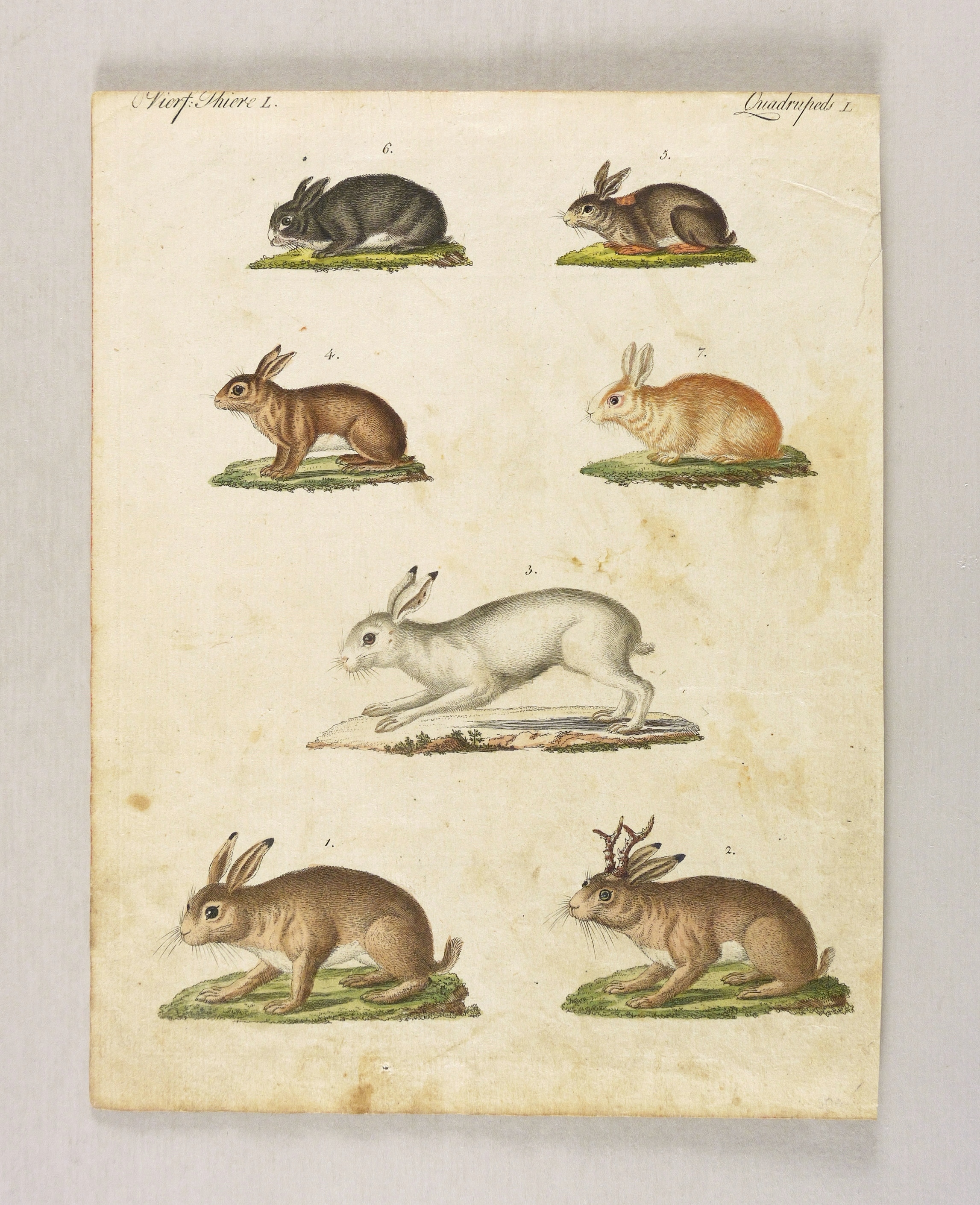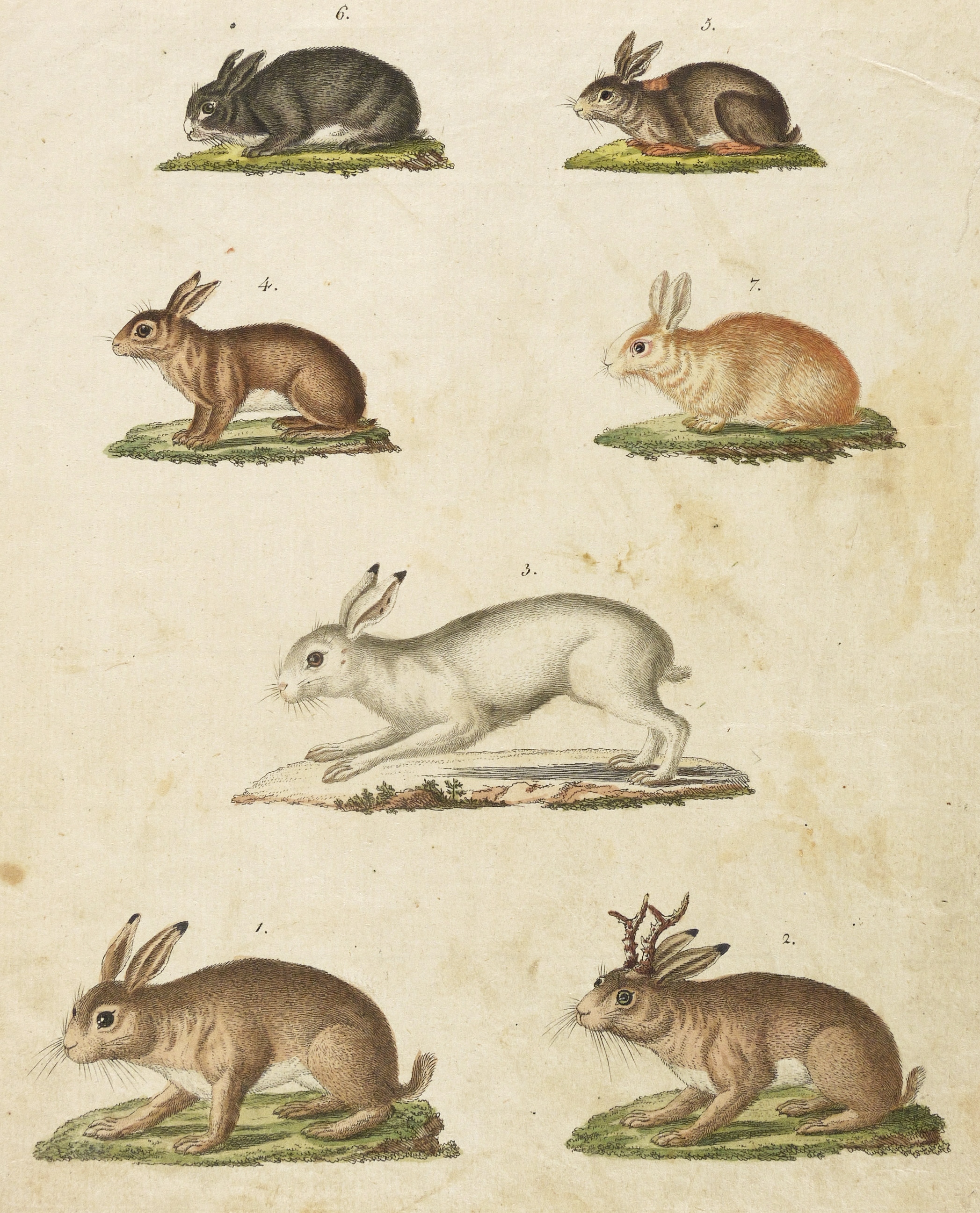 Hasen. – Feldhase, Schneehase, Wildkaninchen & Schneeschuhhase. – Friedrich Justin Bertuch.