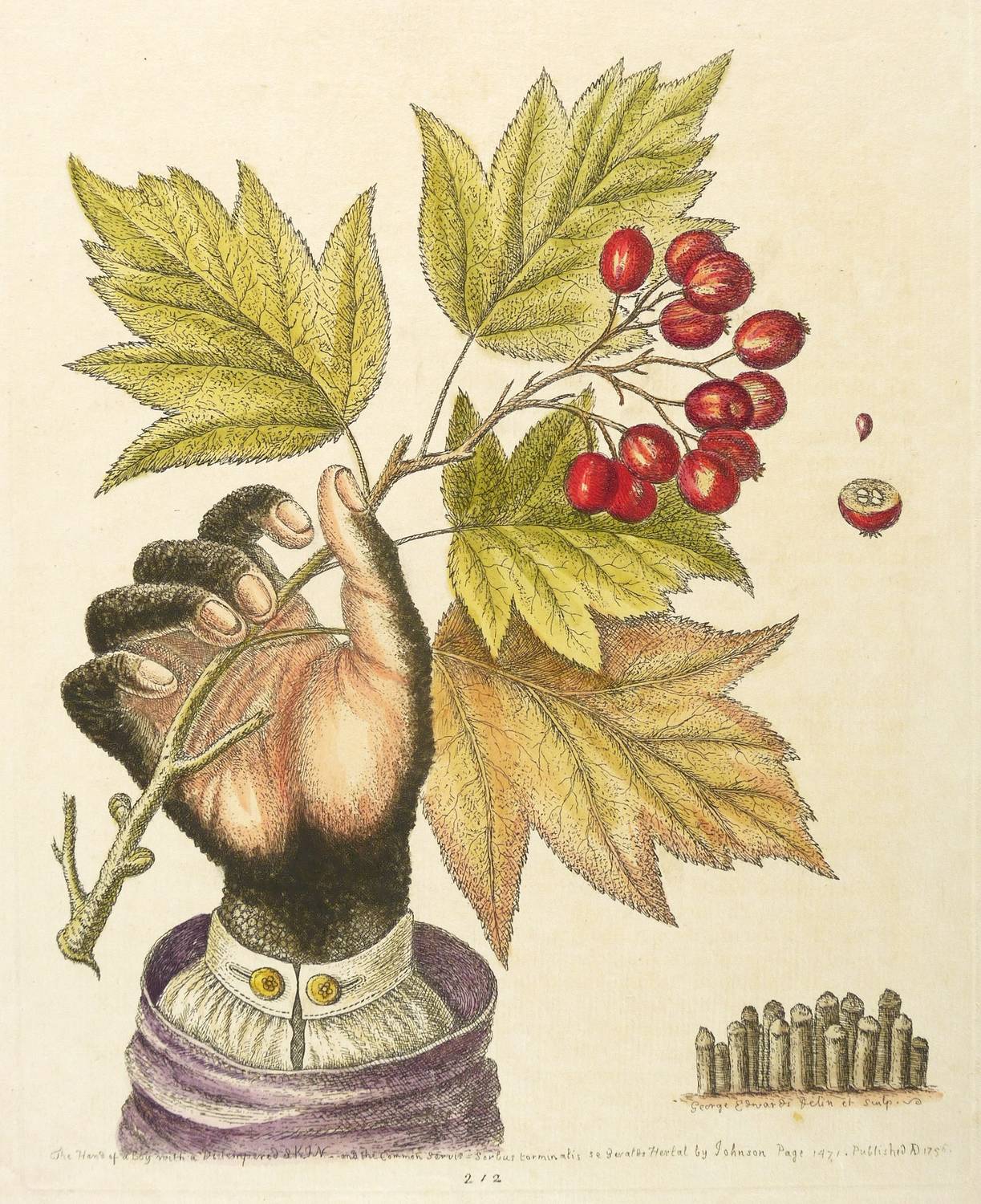 Aus: George Edwards, Gleanings of Natural History. Exhibiting Figures of Quadrupedes, Birds, Plants, Etc. (London: Royal College of Physicians 1758-64). – Rechts unten signiert: ″George Edwards Delin et sculp.″ Unterhalb der Darstellung bezeichnet und datiert: ″The hand of a boy with a distempered skin [...]″ – Leichte Lagerspuren. Sonst guter Zustand.