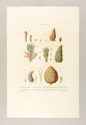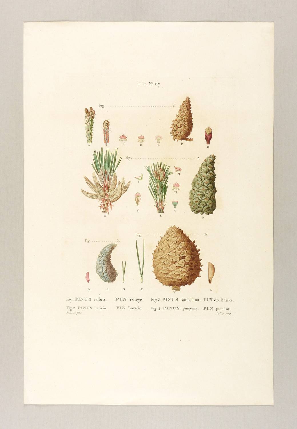 Kieferngewächse. – Pinus pungens, Wald-, See- & Banks-KIefer. – nach Bessa. – „Pinus rubra. Pinus laricio. Pinus banksiana. Pinus pungens”.