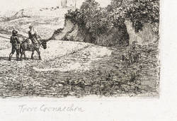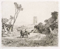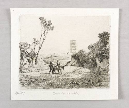 Apell 64. – Wie auch die zweite Ansicht der Folge nicht in der Platte signiert oder sonstwie bezeichnet. Dafür Trockenstempel in der rechten unteren Plattenecke: ″T.E. ERHARD″. Im unteren Blattrand in Bleistift bezeichnet: ″Ap. 64 I // Torre Cornacchia″. – Via Cassia mit der Poststation auf der Straße nach Viterbo. – Provenienz: Sammlung Friedrich Julius Arndt (genannt Fritz Arndt, 1856-1919, Besitzer des Klosterguts Oberwartha bei Dresden), danach Sammlung Dr. Theodor Arndt, Dresden-Blasewitz. – Verso leichte Montagereste. Sehr guter Zustand.