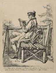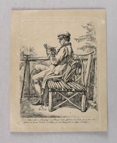 Apell (Bildnisse) 4 II (von II). Jahn 255 II (von II). – Im unteren Rand der Platte bezeichnet, signiert und datiert: ″J.C. Erhard, geb. in Nürnberg d. 21 Februar 1795, gestorben zu Rom, am 18 Jan: 1822. / geäzt von seinem Freunde J.A. Klein, 1822, als Titelvignette zu dessen Nachlaß″. Verso Besitzstempel Siegfried Barden (Lugt 218). – Johann Adam Klein zeigt den Freund auf einer Astbank im Aignerpark bei Salzburg sitzend und ins Skizzenbuch zeichnend. Neben ihm Ranzen und Flasche, vor ihm ein Beilstock angelehnt. – Abzug vom zweiten Zustand der Platte mit den feinen Schattierungen in Ranzen, Stockspitze und Skizzenbuch. – Provenienz: Sammlung Siegfried Barden (Hamburg, 1854-1917), danach Sammlung Dr. Theodor Arndt, Dresden-Blasewitz. – Papier altersbedingt etwas gebräunt. Insgesamt guter Zustand.