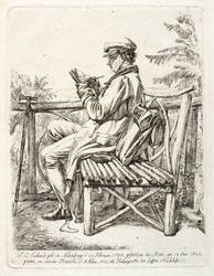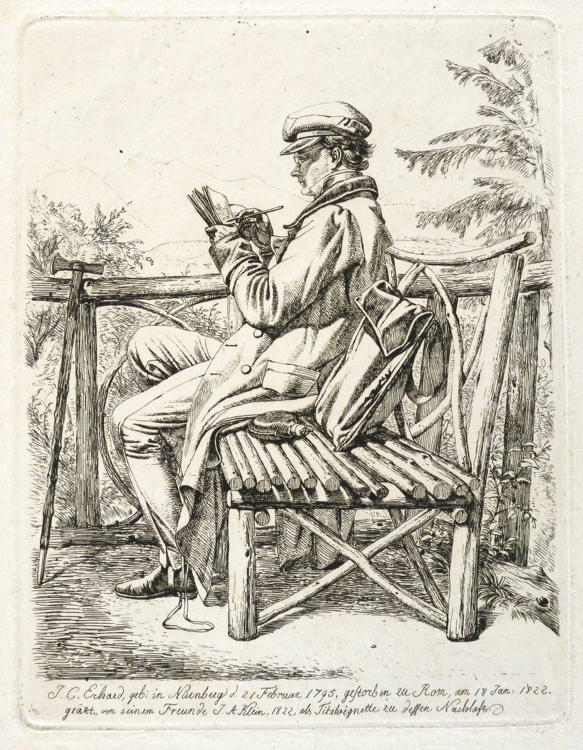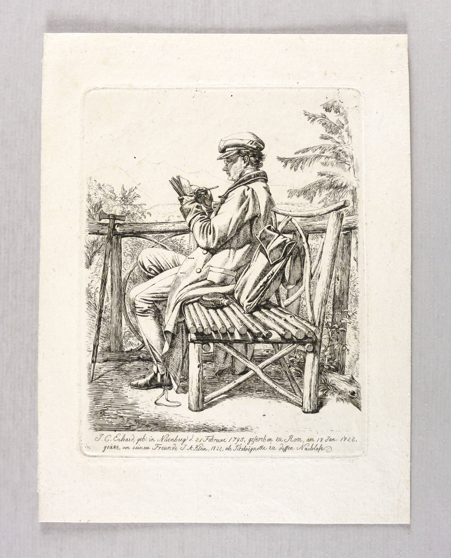 Apell (Bildnisse) 4 I (von II). Jahn 255 I (von II). – Im unteren Rand der Platte bezeichnet, signiert und datiert: ″J.C. Erhard, geb: in Nürnberg d. 21 Februar 1795, gestorben zu Rom, am 18 Jan: 1822. / geäzt von seinem Freunde J.A Klein, 1822, als Titelvignette zu dessen Nachlaß″. Verso von Sammlerhand in Bleistift bezeichnet: ″J. 255 I / Skizzenbuch und Ranzen / Aetzdruck″. – Johann Adam Klein zeigt den Freund auf einer Astbank im Aignerpark bei Salzburg sitzend und ins Skizzenbuch zeichnend. Neben ihm Ranzen und Flasche, vor ihm ein Beilstock angelehnt. – Abzug vom ersten Zustand der Platte ohne die feinen Strichlagen auf der Mitte des Ranzen, an der Stockspitze und im Skizzenbuch. – Sehr selten! – Provenienz: 1947 Kunstantiquariat C.G. Boerner in Leipzig, danach Sammlung Dr. Theodor Arndt in Dresden-Blasewitz. – Tadellos. Sehr guter Zustand.