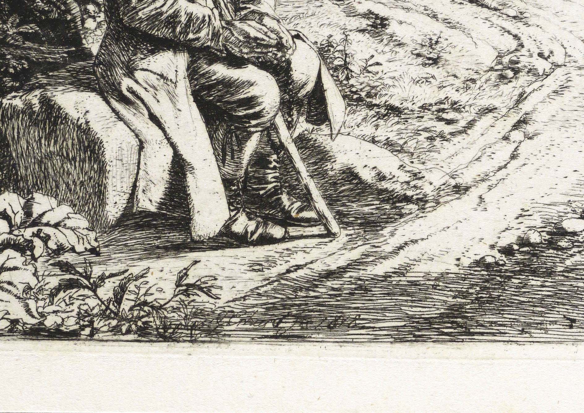 Apell 75 II (von II). – Im unteren Rand der Platte im Schatten des Weges signiert und datiert: ″JC Erhard fec 1818″. In der Blattecke links unten in Bleistift bezeichnet: ″A[pell]. 75 II″. Verso nochmals Titel, Werknummer und Titel. – Fein zeichnender Abzug vom zweiten Zustand der Platte mit allen Vollendungen. Im Selbstverlag des Künstlers ausgegeben. – Provenienz: Sammlung Friedrich Julius Arndt (genannt Fritz Arndt, 1856-1919, Besitzer des Klosterguts Oberwartha bei Dresden), danach Sammlung Dr. Theodor Arndt, Dresden-Blasewitz. – Verso leichte Montagereste. Ohne jeden Tadel erhalten. Sehr guter Zustand.