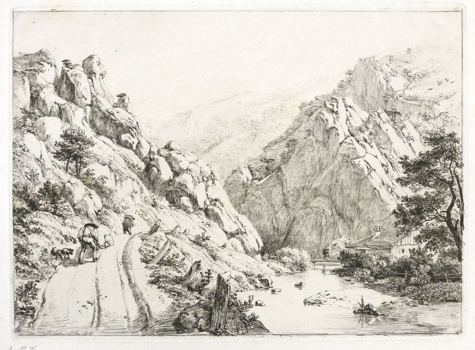 1818. Radierung / Strichätzung & Kaltnadel, in Schwarz, auf feinem hellgelbem Velin. – Originale Künstlergrafik, von Johann Christoph Erhard. – 15,6 x 21,5 cm (Darstellung / Einfassungslinie), 19,5 x 24,8 cm (Blatt), 16,1 x 21,8 cm (Platte).