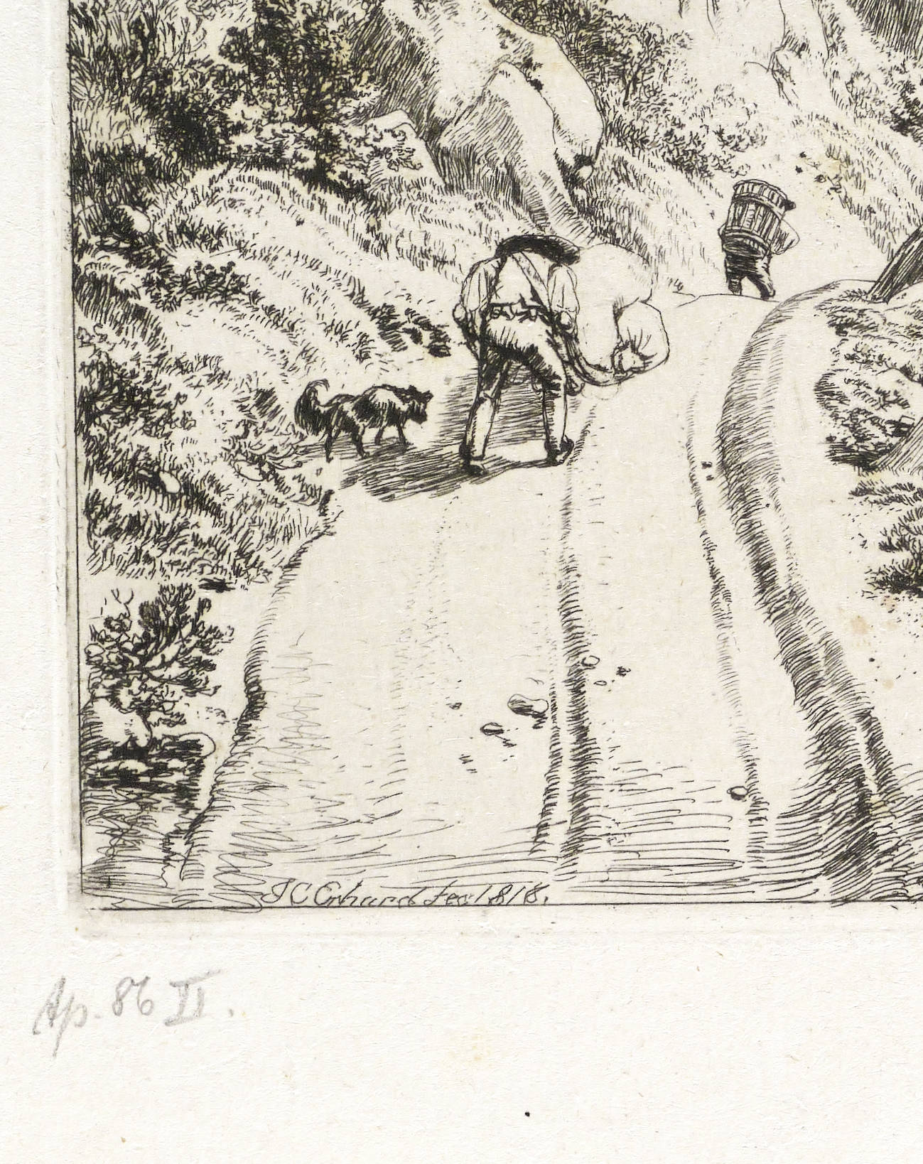 Apell 86 II (von II). – In der Platte links unten im Weg signiert und datiert: ″JC Erhard fec 1818″. Direkt darunter in Bleistift bezeichnet: ″Ap[ell]. 86 II″. Verso nochmals Werknummer und Titel. – Abzug vom zweiten Zustand der Platte mit den Vollendungen aller Gegebenheiten, insonderheit der beiden rechts im Mittelgrund stehenden Häuser. – Die als Naturpark gestaltete Landschaft Brühl (heute Hinterbrühl) entwickelte sich im 19. Jahrhundert zu einer Sommerfrische für's Wiener Bürgertum und wurde beliebter Aufenthalt für Künstlern wie Franz Schubert, Ludwig van Beethoven oder Ferdinand Georg Waldmüller. – Provenienz: Sammlung Friedrich Julius Arndt (genannt Fritz Arndt, 1856-1919, Besitzer des Klosterguts Oberwartha bei Dresden), danach Sammlung Dr. Theodor Arndt, Dresden-Blasewitz. – Verso leichte Montagereste. Hervorragend erhalten. Sehr guter Zustand.