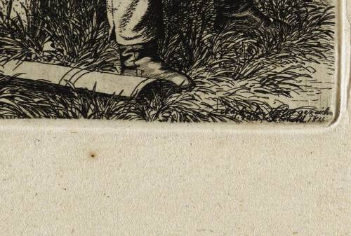 Apell 176 IV (von IV). – In der Platte rechts unten signiert und datiert: ″Nach der Natur gezeichn. u. rad. v. JC Erhard 1815″. Direkt darunter in Bleistift bezeichnet: ″Joh. Christ. Erhard: Der Maler Hoffmann. Apel[l] 176″. Die zweite Platte ebenfalls signiert und datiert. Wasserzeichen Fleur-de-Lys. – Erhard zeigt seinen kleinwüchsigen Künstlerfreund in diesem rührenden Porträt, wie dieser zum ersten Mal en plein air arbeitete. Das geht aus einer Notiz auf der Vorzeichnung zu dieser Radierung hervor. – Vorzüglicher Abzug vom vierten und letzten Zustand der Platte mit allen Vollendungen inklusive der zwei Nadelstriche auf der linken Schulter. – Hauptblatt des Künstlers! – Beigegeben die rechts daneben auf demselben Blatt abgezogene frühe Radierung Erhard's ″Der Stein mit der römischen Jahreszahl″ (1812, Apell 63 III, 10,3 x 13,7 cm). – Provenienz: Sammlung Friedrich Julius Arndt (genannt Fritz Arndt, 1856-1919, Besitzer des Klosterguts Oberwartha bei Dresden), danach Sammlung Dr. Theodor Arndt, Dresden-Blasewitz. – Verso unscheinbare Montagereste. Hervorragend erhalten. Sehr guter Zustand.