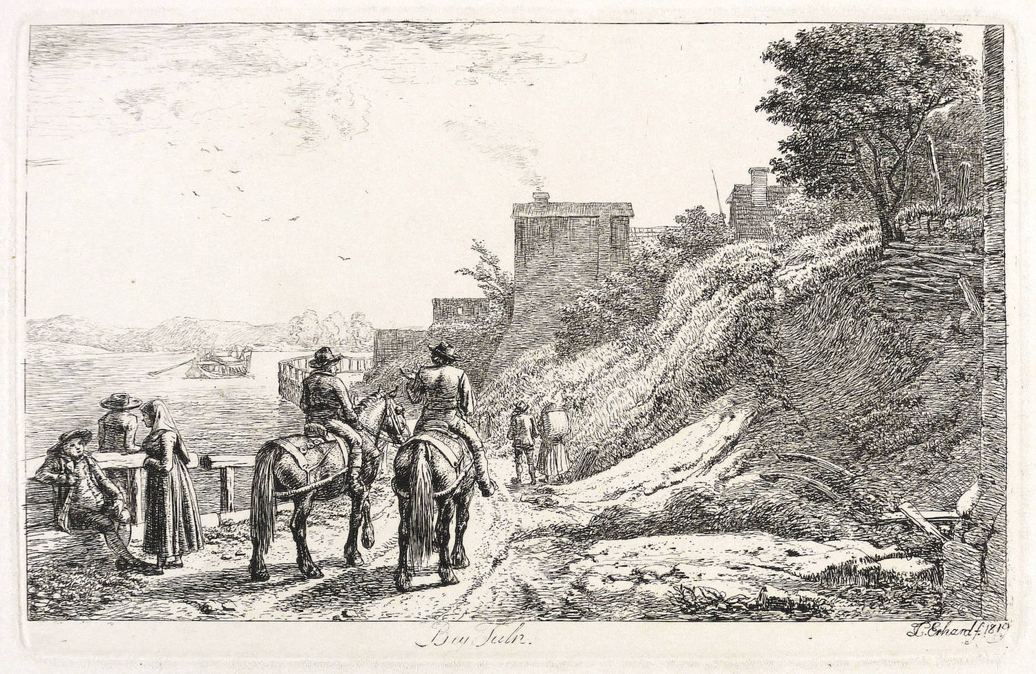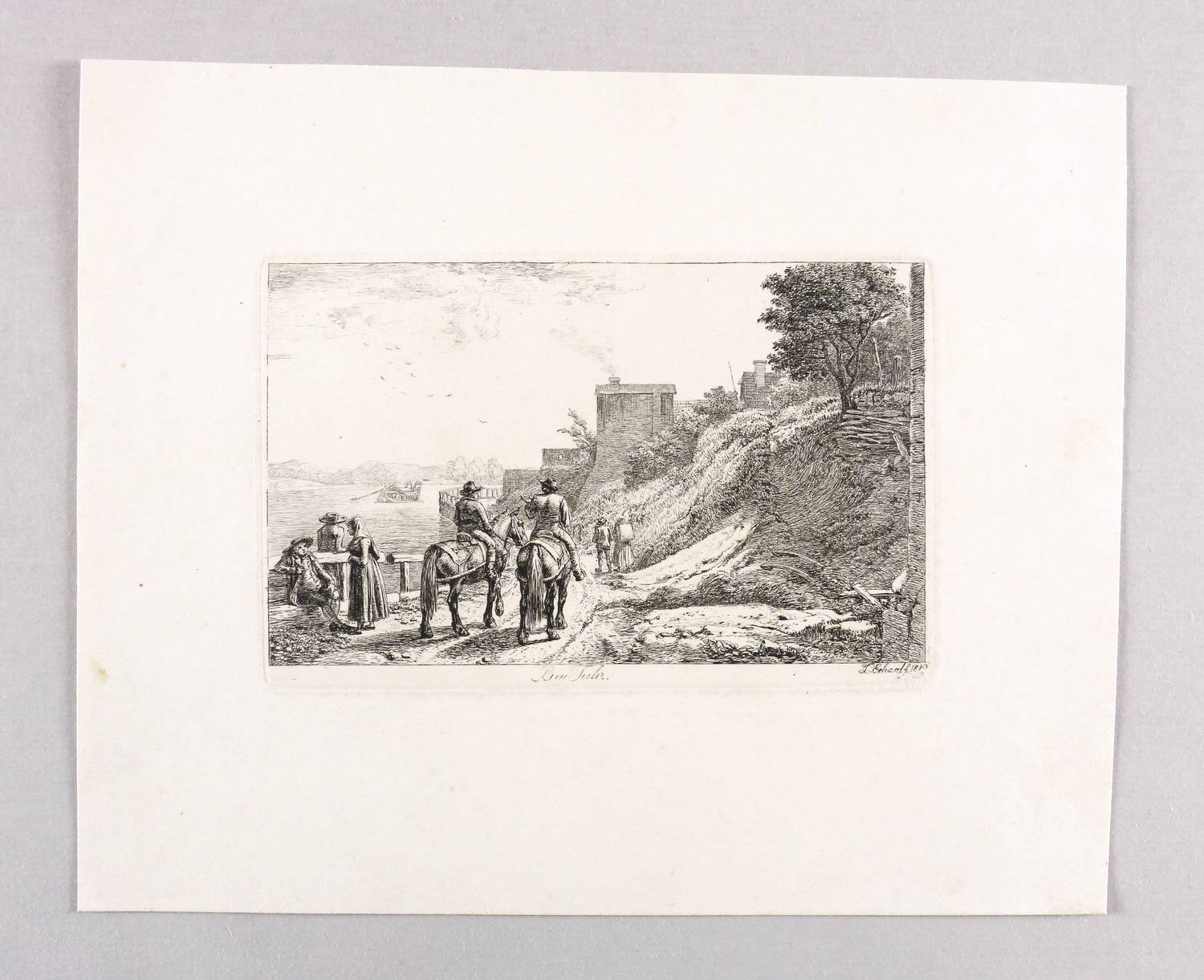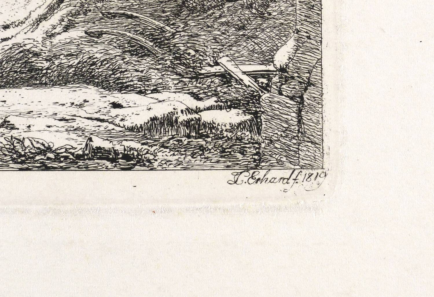 Apell 7 II (II). – In der Platte rechts unten signiert und datiert: ″JC Erhard f. 1819″. Mittig bezeichnet: ″Bey Tuln″. – Abzug vom zweiten und letzten Zustand der Platte mit den Vollendungen aller Gegebenheiten und dem geänderten B im Titel. – Provenienz: Sammlung Friedrich Julius Arndt (genannt Fritz Arndt, 1856-1919, Besitzer des Klosterguts Oberwartha bei Dresden), danach Sammlung Dr. Theodor Arndt, Dresden-Blasewitz. – Verso leichte Montagereste. Bestens erhalten. Sehr guter Zustand.