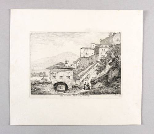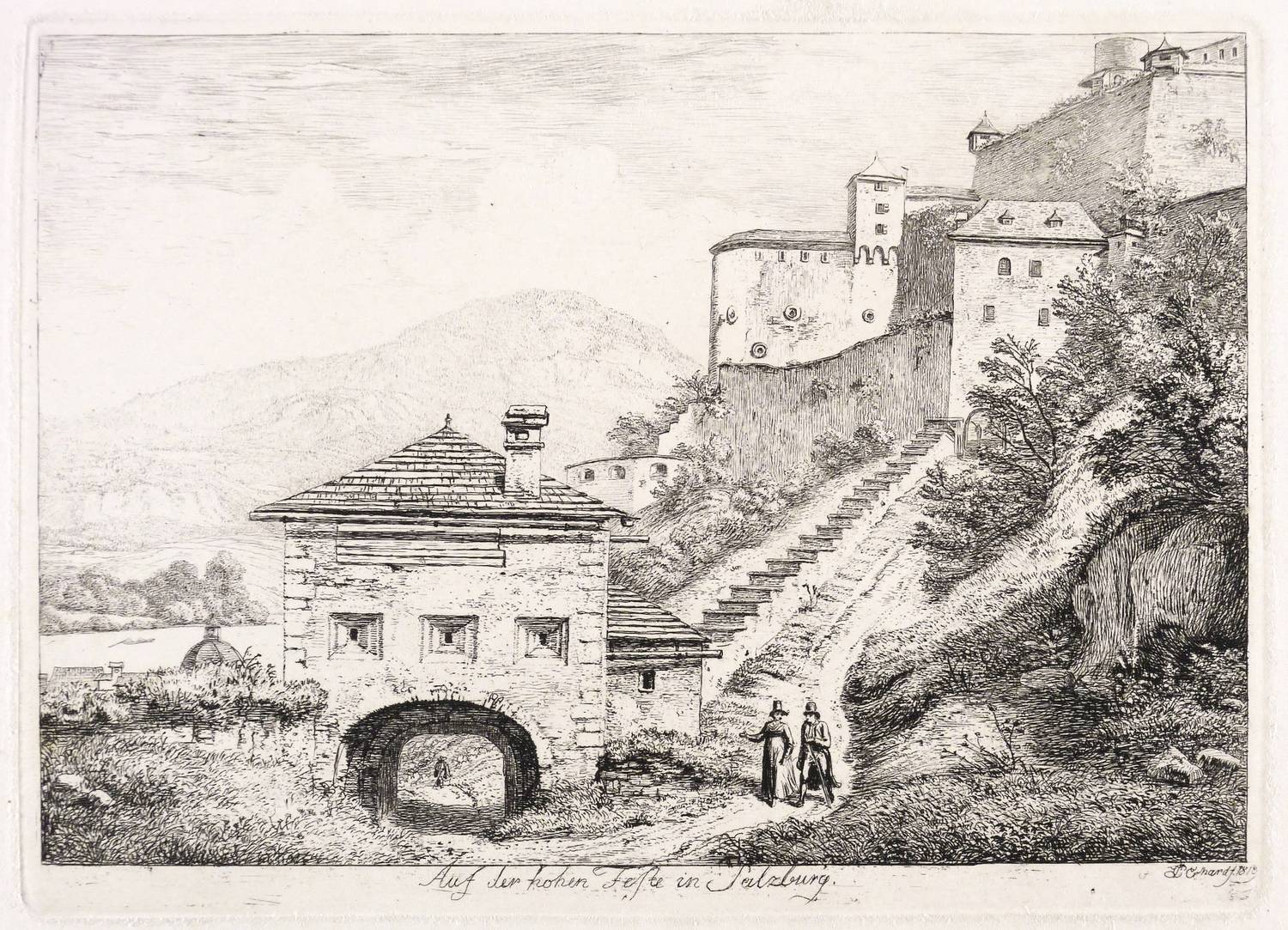 Apell 6 II (von II). – In der Platte rechts unten signiert und datiert: ″JC Erhard f. 1819″ Mittig Titel: ″Auf der hohen Feste in Salzburg″. – Abzug vom zweiten Zustand der Platte mit der Vollendung aller Gegebenheiten. – Provenienz: Sammlung Friedrich Julius Arndt (genannt Fritz Arndt, 1856-1919, Besitzer des Klosterguts Oberwartha bei Dresden), danach Sammlung Dr. Theodor Arndt, Dresden- Blasewitz. – Breiter Papierrand um Platte und Darstellung. Leichte Montagespuren rückseitig. Sehr guter Zustand.