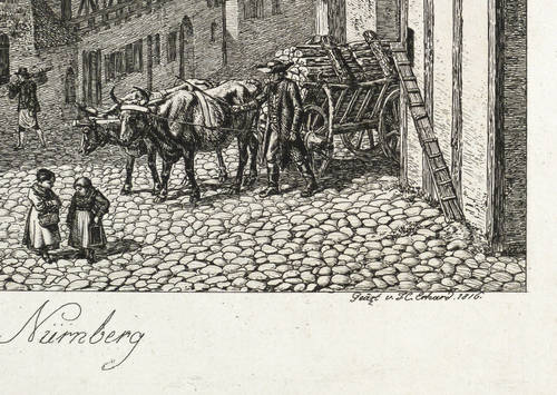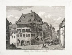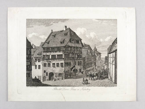 Apell 17 III (von III). – In der Platte rechts unten signiert und datiert: ″Geäzt v. J.C. Erhard. 1816.″ Links gegenüber bezeichnet: ″Nach der Natur gez. v. J.A. Klein 1815″. Mittig Titel: ″Albrecht Dürers Haus in Nürnberg″. – Radiert nach einer 1815 gezeichneten Vorlage vom Studienkollegen und Künstlerfreund Johann Adam Klein. – Abzug vom dritten Zustand der Platte mit der Vollendung aller Gegebenheiten der Darstellung. – Provenienz: Sammlung Friedrich Julius Arndt (genannt Fritz Arndt, 1856-1919, Besitzer des Klosterguts Oberwartha bei Dresden), danach Sammlung Dr. Theodor Arndt, Dresden- Blasewitz. – Im unteren Rand kleiner restaurierter Einriss. Minimale Alterspuren. Guter Zustand.