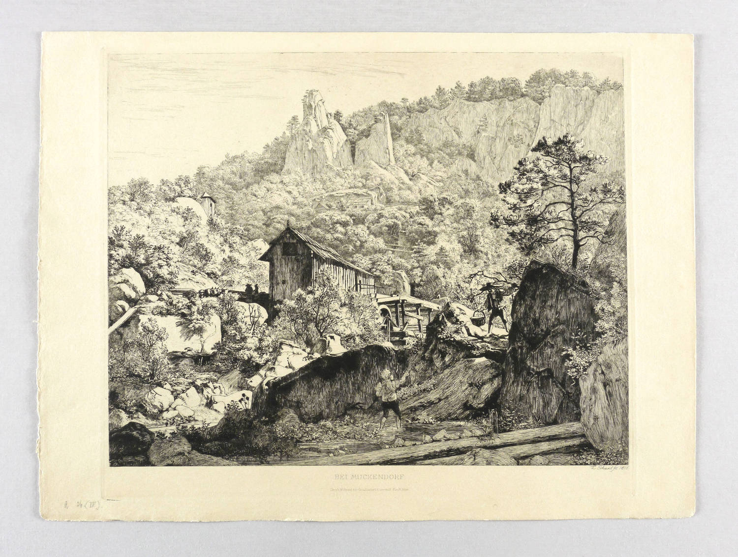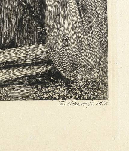 Apell 26 III (von III). – In der Platte rechts unten signiert und datiert: ″JC. Erhard fec. 1818.″ Unterhalb der Darstellung mittig betitelt: ″BEI MUCKENDORF″: Darunter Verlagsadresse. In der Blattecke links unten in Bleistift Werknummer. – Druck für die Gesellschaft für vervielfältigende Kunst in Wien im Jahre 1892. – Provenienz: Sammlung Friedrich Julius Arndt (genannt Fritz Arndt, 1856-1919, Besitzer des Klosterguts Oberwartha bei Dresden), danach Sammlung Dr. Theodor Arndt in Dresden- Blasewitz. – Blatt sehr schön erhalten. Sehr guter Zustand.