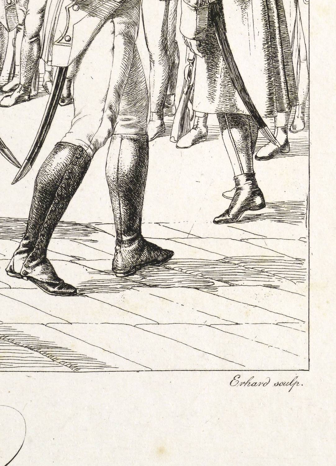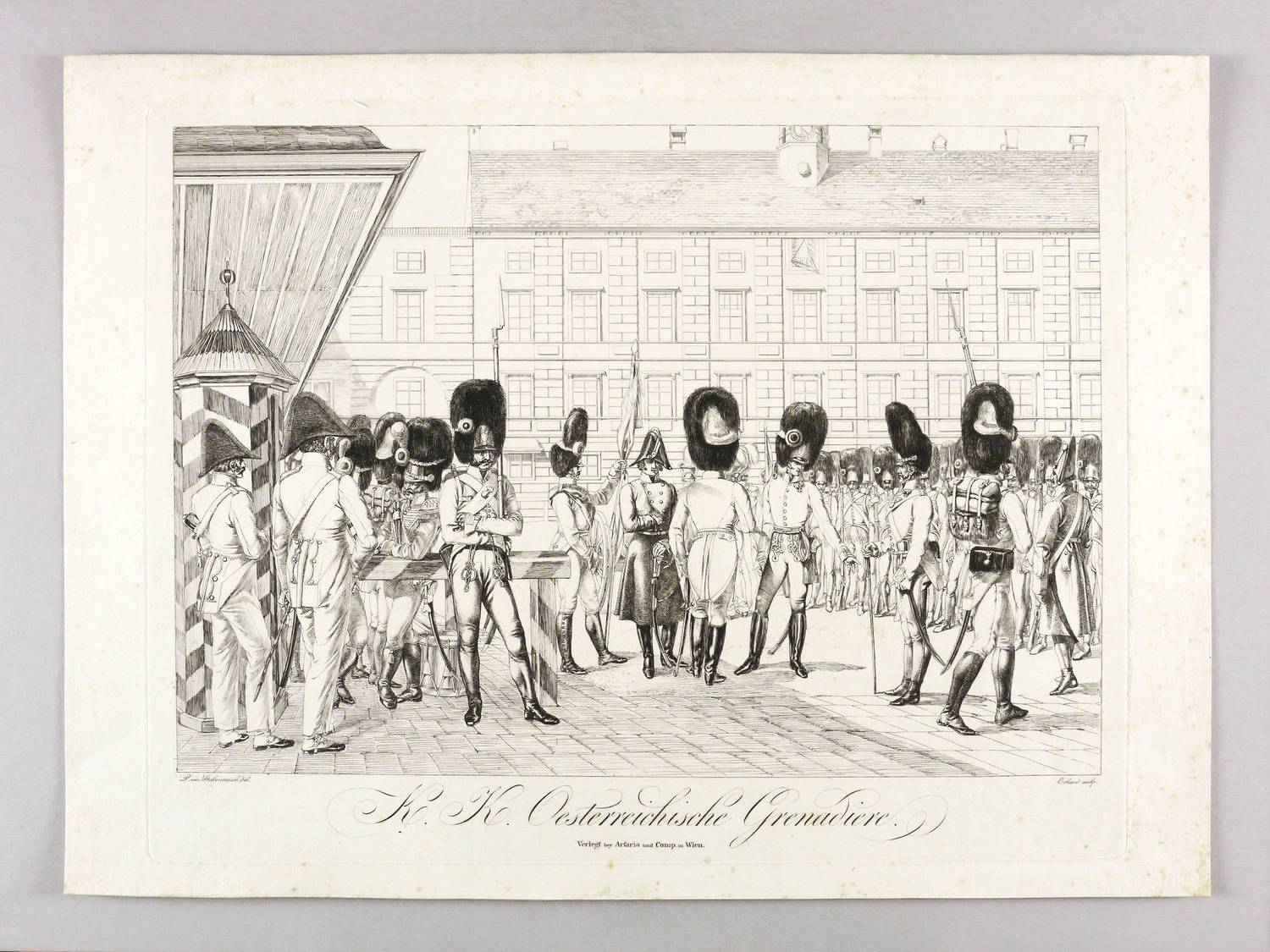 Apell 124 III (von V). – In der Platte rechts unten signiert: ″Erhard sculp.″ Links gegenüber bezeichnet: ″P. von Stubenrauch del.″ Zentral unter der Darstellung gestochener Titel: ″K.K. Oesterreichische Grenadiere.″ Darunter Verlagsadresse: ″Verlegt bey Artaria und Comp. in Wien.″ Verso in Bleistift bezeichnet: ″Ap[ell]. 124, II″. – Zahlreiche Grenadiere beim Wachwechsel im Inneren Burghof, mit Blick auf die Amalienburg der Hofburg. – Seltener Abzug vom dritten von insgesamt fünf Zuständen der Platte vor der Verkleinerung der Bärenmützen. – Provenienz: Sammlung Friedrich Julius Arndt (genannt Fritz Arndt, 1856-1919, Besitzer des Klosterguts Oberwartha bei Dresden), danach Sammlung Dr. Theodor Arndt, Dresden-Blasewitz. – Schöner altersgerechter Zustand. Geringfügig stockfleckig. Guter Zustand.