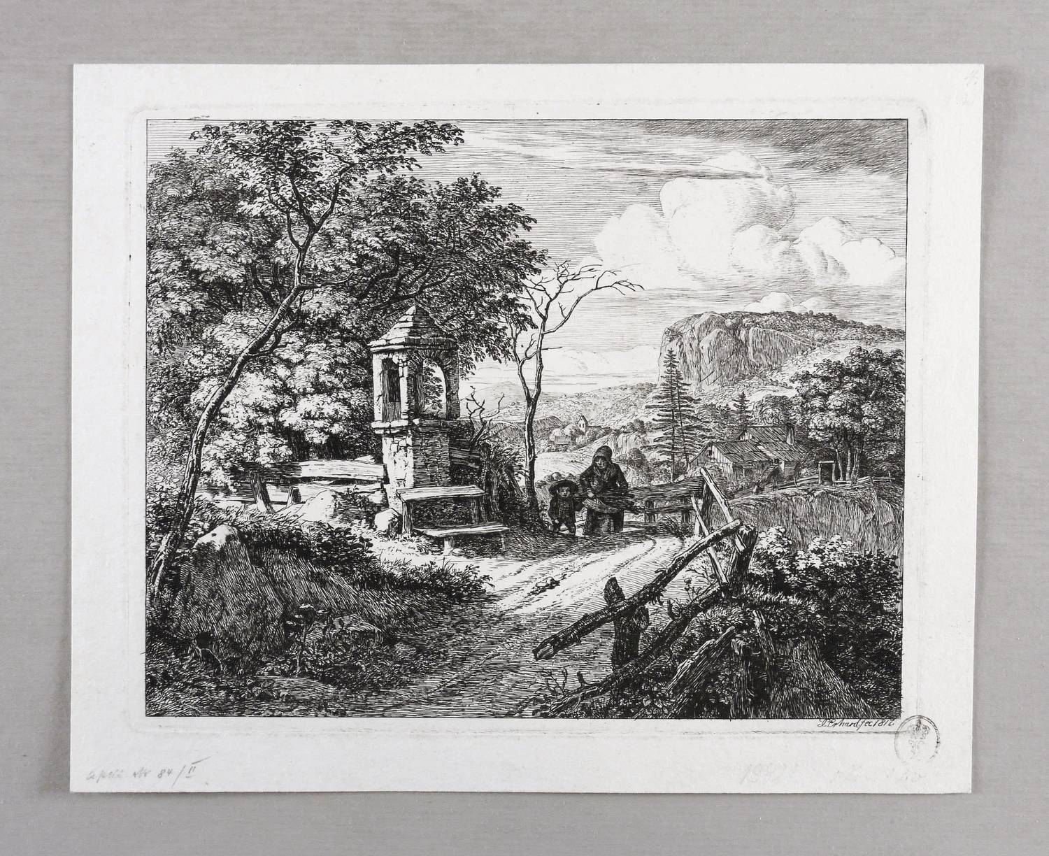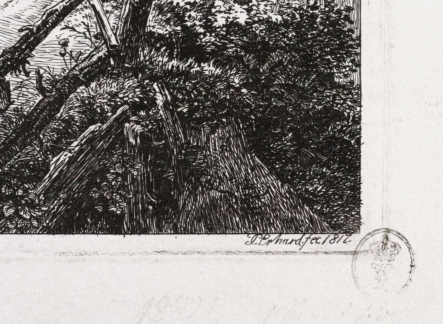 Apell 84 II (von III). – In der Platte rechts unter der Darstellung signiert und datiert: ″JC. Erhard fec. 1817.″ In der linken unteren Blattecke von Sammlerhand in Bleistift bezeichnet: ″Apell Nr. 84 / II″. An der Plattenkante rechts unten Besitzstempel Fürst Leopold I. von Anhalt-Dessau in Schwarz (1676-1747, Lugt L.1708b). – Detailreicher qualitätsvoller Abzug vom zweiten Zustand der Platte mit den Vollendungen aller Gegebenheiten, ohne die Adresse von Ferdinand Kettner in Wien. – Provenienz: Sammlung der Fürsten von Anhalt-Dessau (der Stempel von Leopold I. fand nach dessen Tod weiter Verwendung, vermutlich unter Leopold IV. Friedrich, 1794-1871), dann Sammlung Friedrich Julius Arndt (genannt Fritz Arndt, 1856-1919, Besitzer des Klosterguts Oberwartha bei Dresden), danach Sammlung Dr. Theodor Arndt in Dresden-Blasewitz. – Ohne Tadel. Sehr guter Zustand.