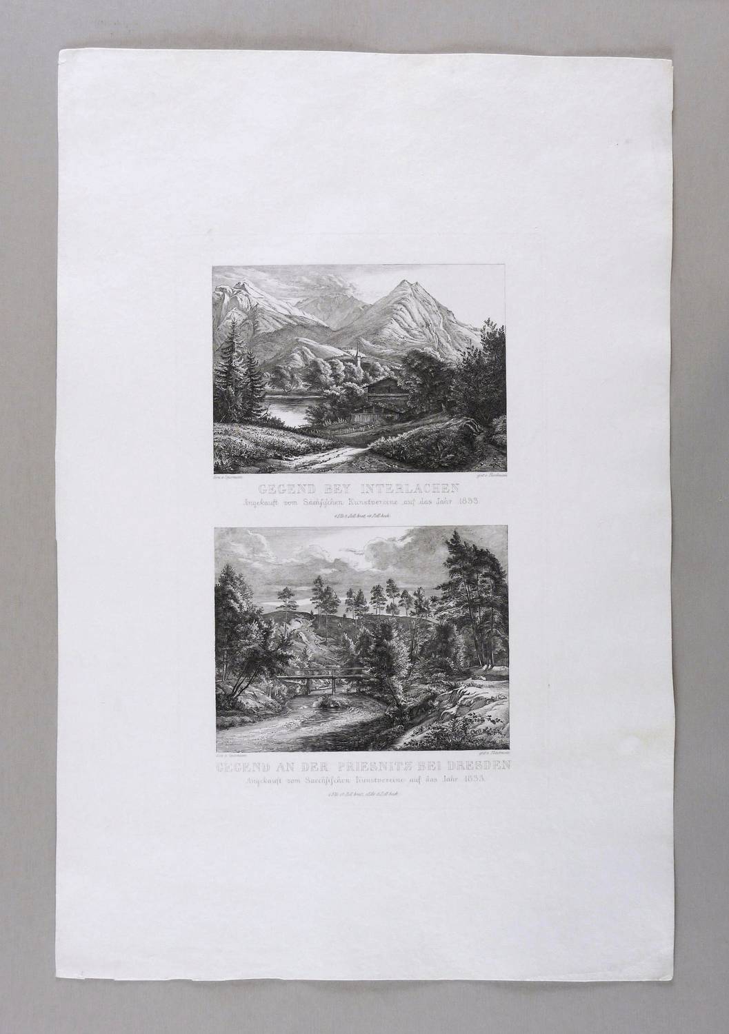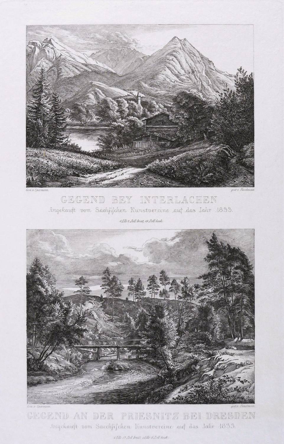 Kovalevski B-C 102b. Kovalevski BC 102a. – Aus: Bilderchronik des Sächsischen Kunstvereins (Dresden: Sächsischer Kunstverein 1828-1836). – In der Platte jeweils rechts unter der Darstellung signiert: ″gest. v. Fleischmann.″ Jeweils links bezeichnet: ″Gem. v. Sparmann″. Mittig betitelt. – Guter Zustand.