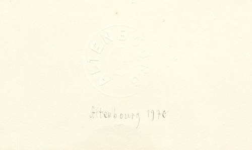 Gerhard Altenbourg (1926 Rödichen-Schnepfetal - 1989 Meißen). Deutscher Maler und Grafiker. 1929 Umzug nach Altenburg. 1944-45 Soldat im Zweiten Weltkrieg. 1946-48 als Schriftsteller und Journalist tätig, Zeichenunterricht bei Erich Dietz. 1948-50 Studium an der Hochschule für Baukunst und Bildende Kunst in Weimar bei Hans Hoffmann-Lederer. 1959 Teilnahme an der documenta II in Kassel. 1961 Gastatelier an der Kunstakademie in Westberlin. 1961 Erwerb einiger Arbeiten durch das Museum of Modern Art in New York. 1962-89 Atelier in Altenburg, Annahme des Künstlernamens "Altenbourg". 1966 Burda-Preis für Grafik in München. 1968 Will-Grohmann-Preis in Westberlin. 1970 Mitglied der Akademie der Künste, Berlin. 1977 Teilnahme an der documenta 6 und Mitgliedschaft bei der „Life Fellow of the International Biographical Association“ in Cambridge. In den 1980er Jahren Ausstellungsverbot und Schließung der Ausstellungen, da er sich den offiziellen Kunstauffassungen der DDR widersetzte. Seit 1998 vergibt das Lindenau-Museum in Altenburg aller zwei Jahre den Gerhard-Altenbourg-Preis.
