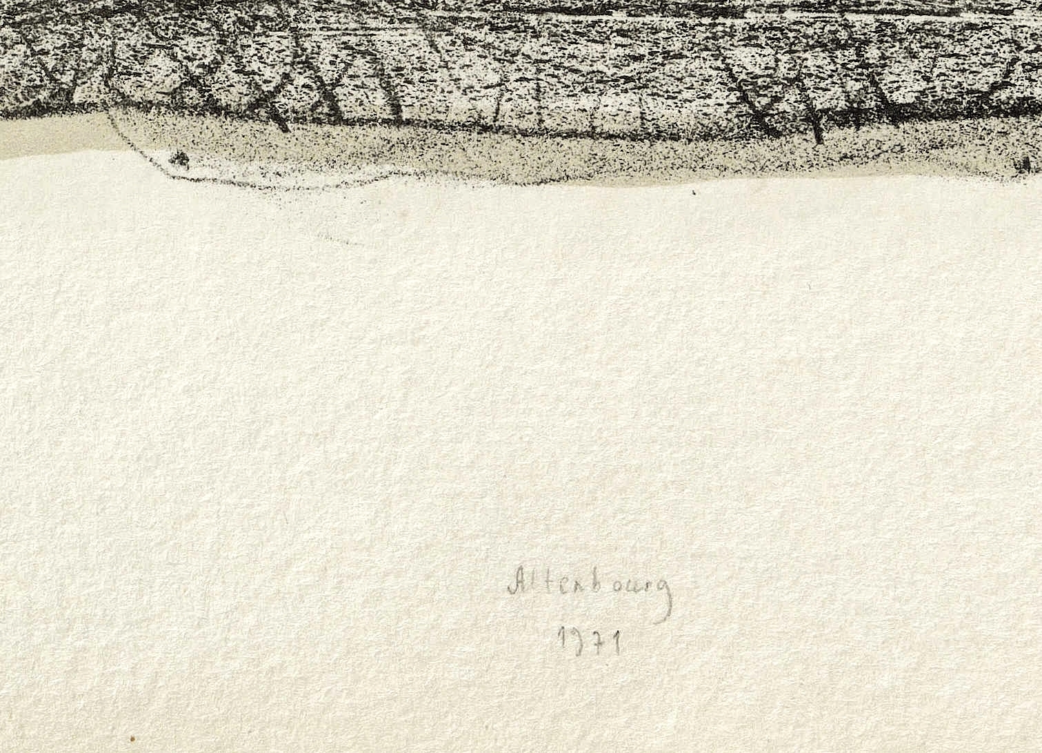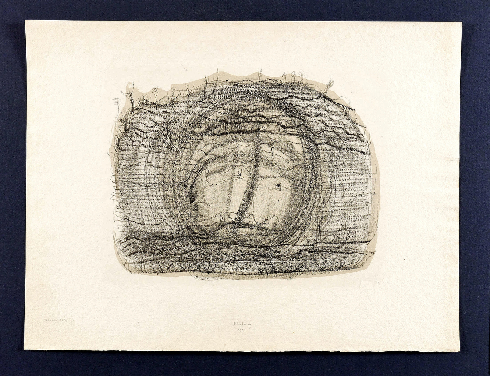 Janda L 144 II. – Unten mittig in Bleistift signiert und datiert: ″Altenbourg 1971″. Links unten bezeichnet: ″Drucker-Exemplar″. – Dieses Exemplar war Janda nicht bekannt, da sie es im Werkverzeichnis nicht explizit erwähnt. In dieser Farbvariante offenbar das einzige bisher bekannte Blatt. - Selten. – Originalrandiges Exemplar. Der äußere Rand leicht gegilbt und partiell minimal gewellt. Insgesamt guter Zustand.