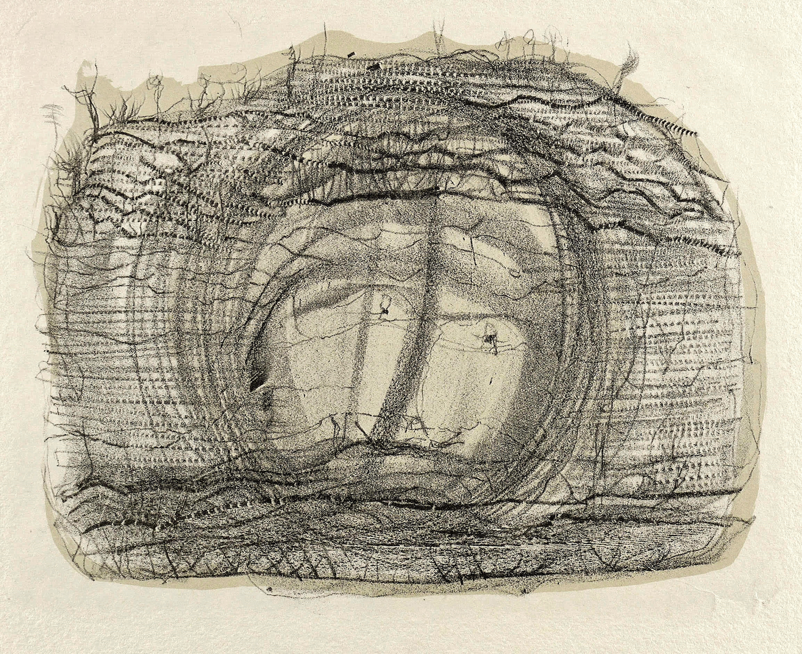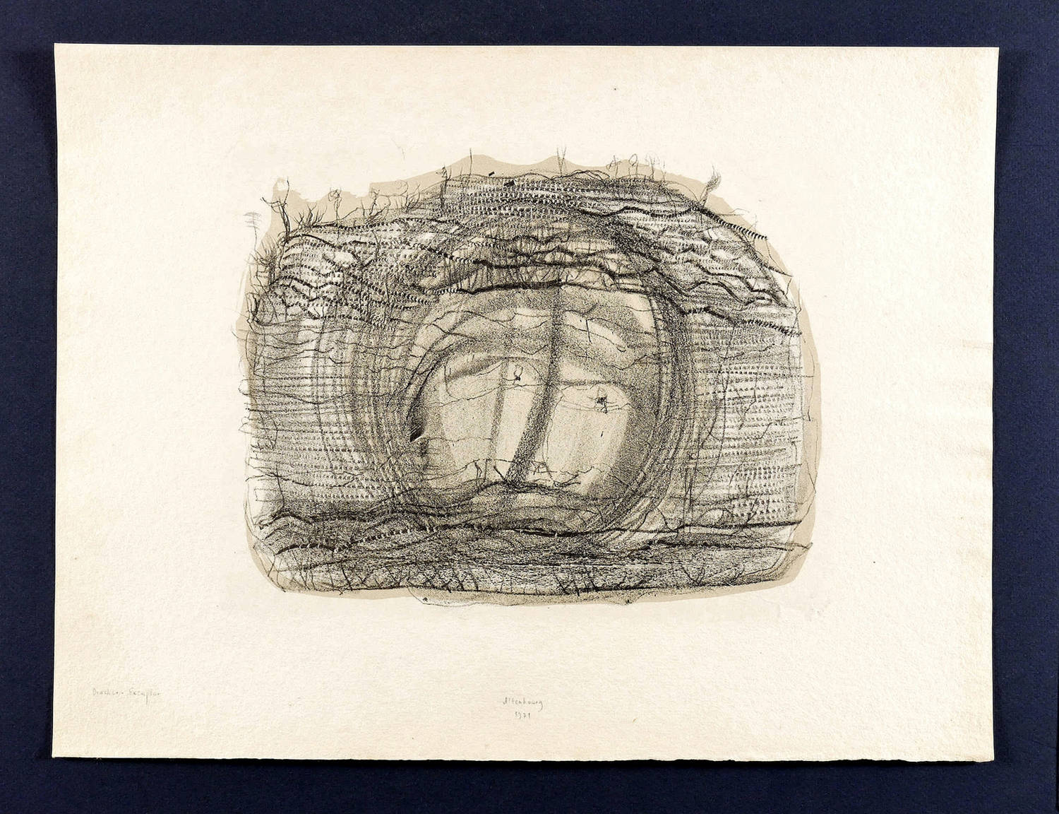 1971. Farblithografie / Kreide- & Pinsellithografie, in Grauocker & Schwarz, auf kräftigem gelblichem Büttenkarton. – Originale Künstlergrafik, von Gerhard Altenbourg. – Druckerexemplar. – 19,5 x 24,6 cm (Darstellung / Druckbild), 30 x 40 cm (Blatt).