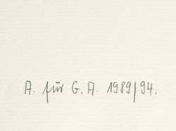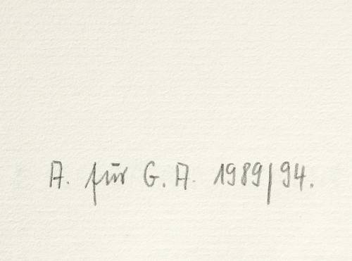 Janda L 130. – Nicht handsigniert. Unterhalb Trockenstempel des Künstlers. Links unten in Bleistift Signatur von Anneliese Ströch: ″A. für G.A. 1989/94.″ – Aus einer Auswahl vom Künstler kurz vor seinem Tod 1989 für eine Mappenedition vorbereiteter Lithografien, deren Druck Horst Arloth in Leipzig besorgte. - Von dieser Lithografie existieren nur insgesamt 15 zu Lebzeiten sowie 17 posthum gedruckte Exemplare. – Tadelloser Zustand.