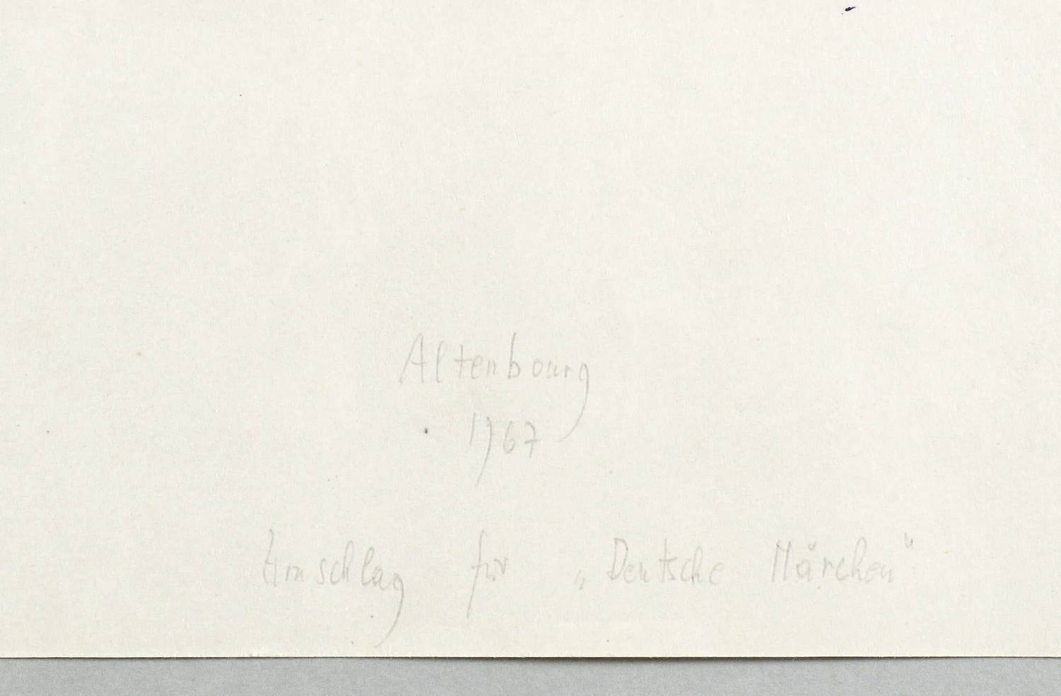 Janda L 120 II 2 b. – Unterhalb in Bleistift signiert und datiert: ″Altenbourg / 1967″. Darunter bezeichnet: ″Umschlag für 'Deutsche Märchen'″. Links Auflagenbezeichnung. Im Stein Inschrift. – Einer von vier Probedrucken. Zusammendruck der Steine I und II. Die 50 Auflagen-Exemplare zur Deckel-Gestaltung der Mappe ″Deutsche Märchen″ (Kabinettpresse Berlin) blieben unsigniert. – Papier im Rand bisweilen leicht bestoßen. Sonst ohne Mängel. Guter Gesamtzustand.