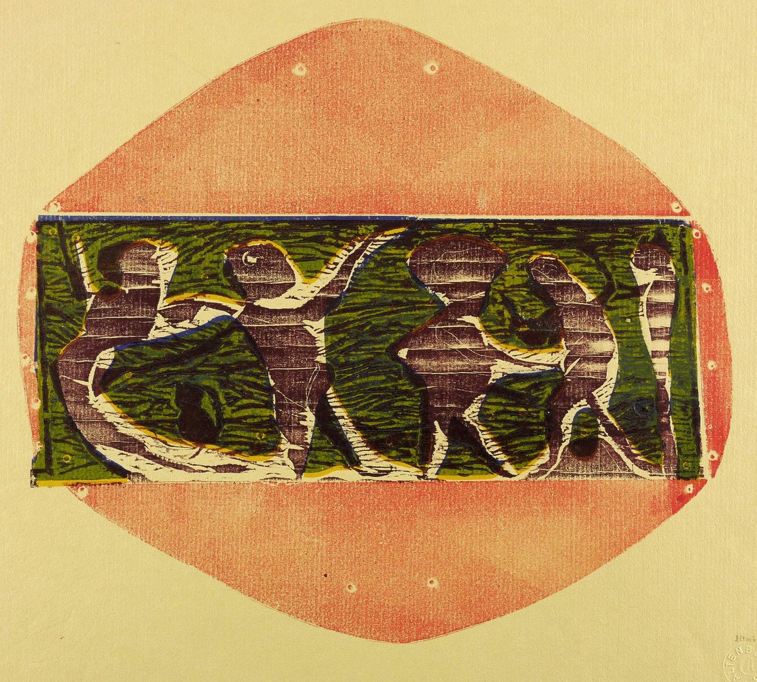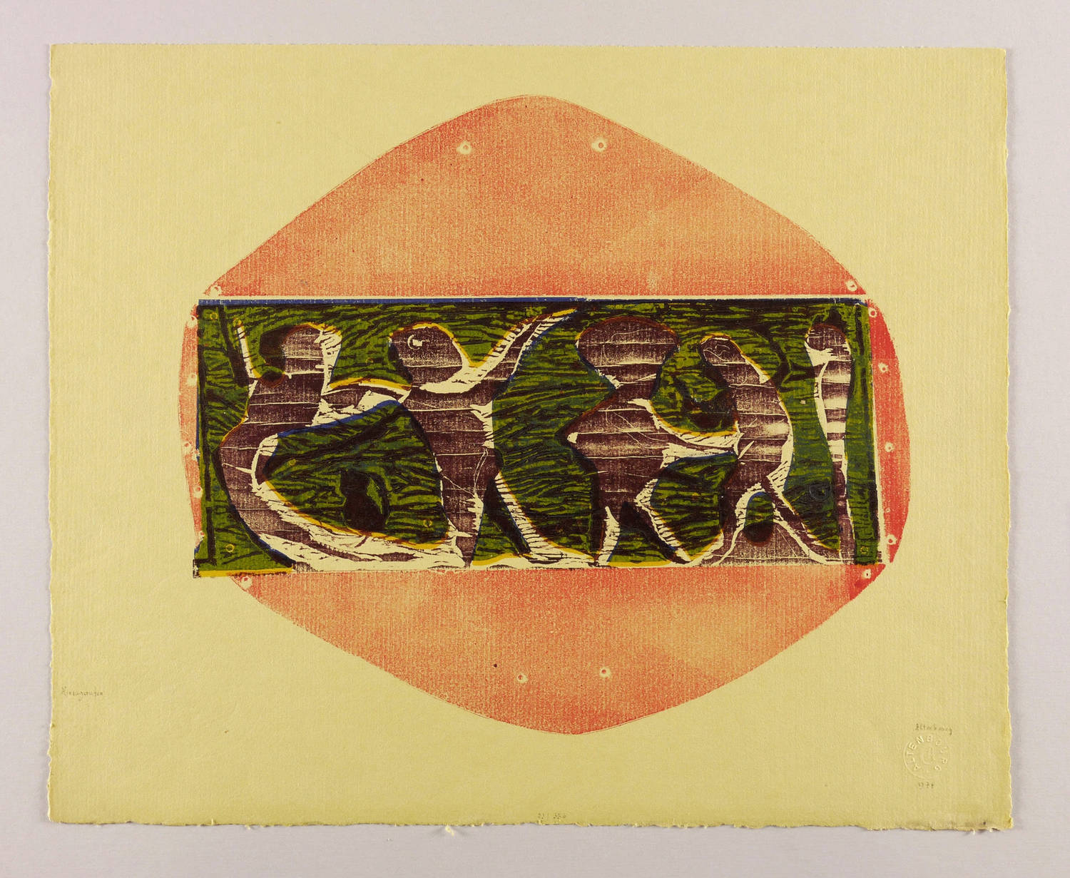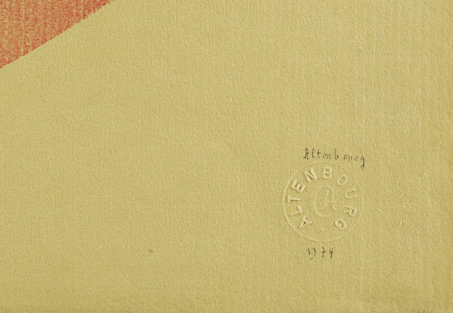 1974. Farbholzschnitt, in Violett-Schwarz, Blau, Gelb & Rot, auf Fabriano-Bütten. – Originale Künstlergrafik, von Gerhard Altenbourg. – Auflage Exemplar Nr. 23/35. – 32,6 x 36,9 cm (Darstellung / Druckbild), 40 x 49 cm (Blatt).